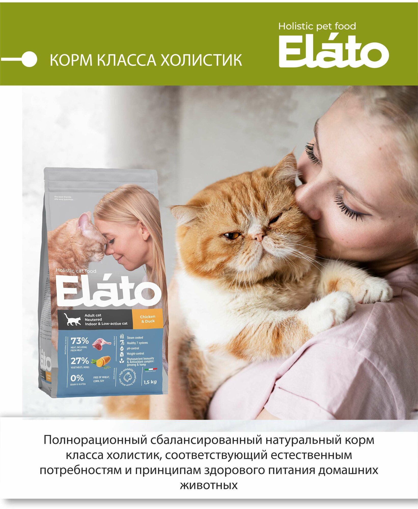 Elato Holistic Элато Холистик 1,5кг корм для стерилизованных и малоактивных кошек с курицей и уткой