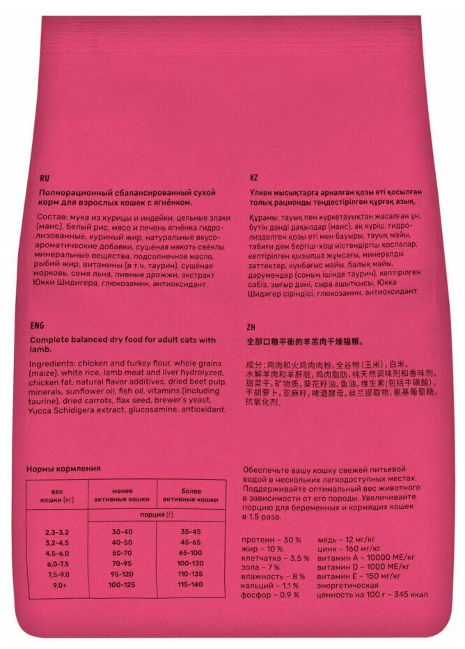 | Состав | мука из курицы и индейки, цельные злаки (маис), белый рис, мясо и печень ягнёнка гидролизованные, куриный жир, натуральные вкусо-ароматические добавки, сушёная мякоть свёклы, минеральные вещества, подсолнечное масло, рыбий жир, витамины (в т.ч. таурин), сушёная морковь, семя льна, пивные дрожжи, экстракт юкки Шидигера, глюкозамин, антиоксидант |