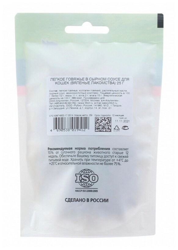 | Состав | легкое говяжье, коллаген говяжий, растительные масла, сырный соус, аминокислотный комплекс; в 100 г: белки 72 г, жиры 11 г, зола 2 г, влага 15 г. Энергетическая ценность на 100 г: 389 ккал |