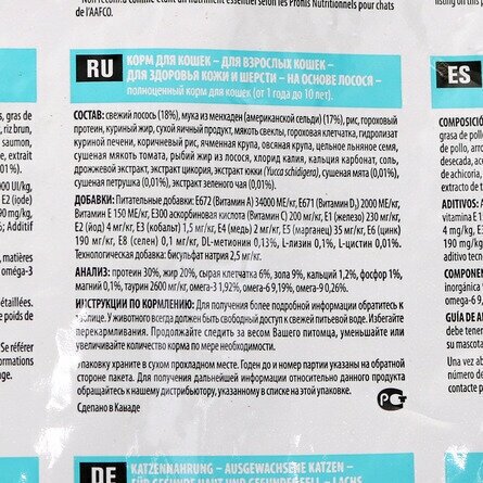 | Состав | свежий лосось (18%), мука из сельди менхаден (17%), рис, гороховый протеин, куриный жир, сохраненный смесью натуральных токоферолов (витамин Е), сушеное яйцо, мякоть свеклы, клетчатка гороха, гидролизат куриной печени, коричневый рис, специально обработанные ядра ячменя и овса, цельное семя льна, жир лосося, сушеная мякоть томата, калия хлорид, лецитин, кальция карбонат, холина хлорид, соль, кальция пропионат, натрия бисульфат, таурин, DL- метионин, L-лизин, экстракт дрожжей, железа сульфат, аскорбиновая кислота (витамин С), экстракт цикория, цинка оксид, натрия селенит, альфа-токоферол ацетат (витамин Е), никотиновая кислота, экстракт юкки Шидигера, L-цистин, кальция иодат, марганца оксид, L-карнитин, D-кальция пантотенат, тиамина мононитрат, рибофлавин, пиридоксина гидрохлорид, витамин А, холекальциферол (витамин Д3), биотин, сушеная мята (0,01%), сушеная петрушка (0,01%), экстракт зеленого чая (0,01%), цинка протеинат, витамин В12, кобальта карбонат, фолиевая кислота, марганца протеинат, меди протеинат |
