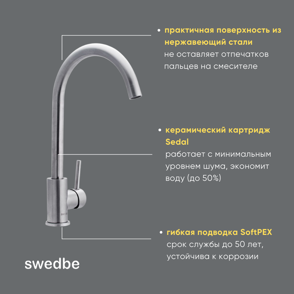 Смеситель Swedbe Selene для кухни поворотный излив, нерж сталь 7441 интересное: