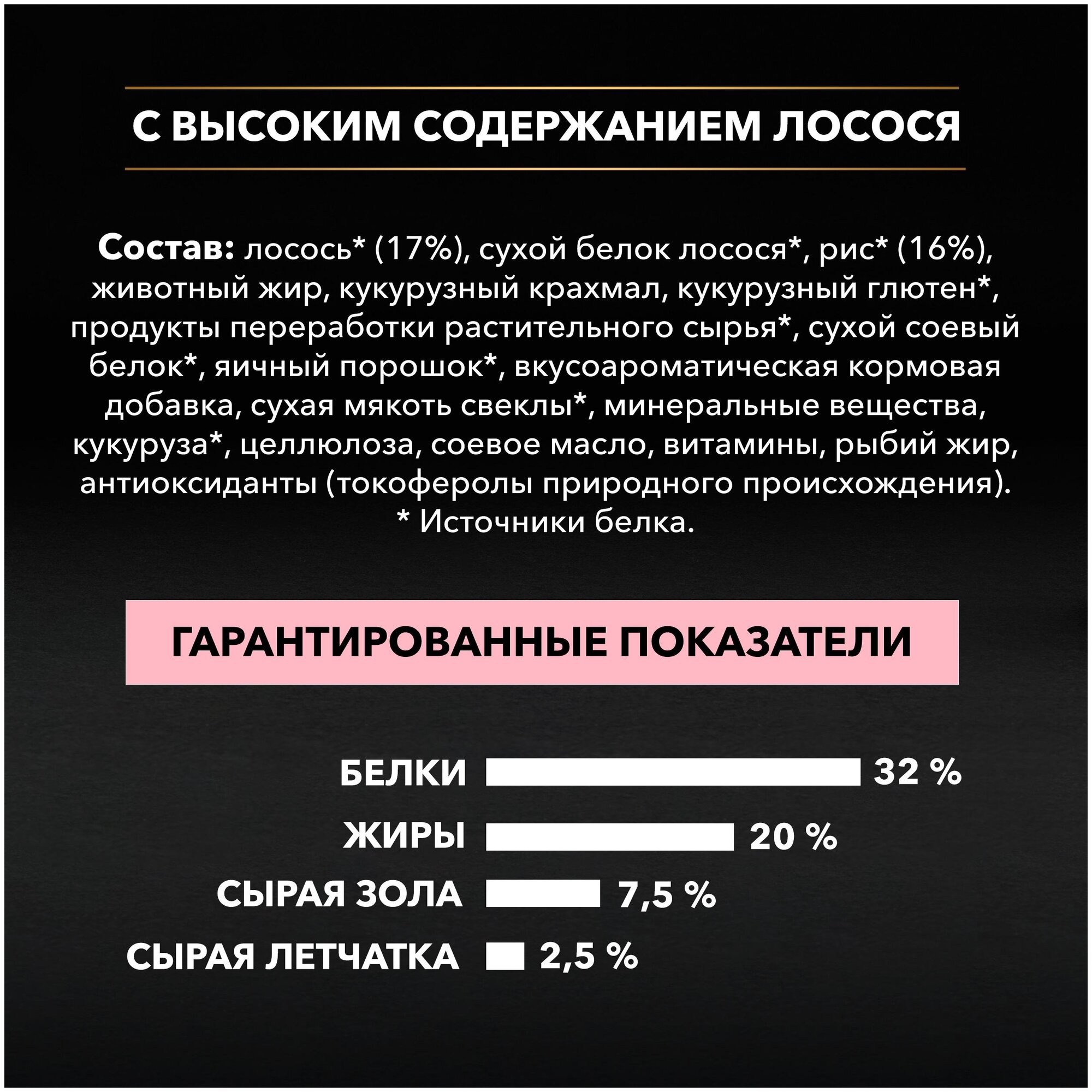 | Состав | лосось (17%), сухой белок лосося, рис (16%), животный жир, кукурузный крахмал, кукурузный глютен, продукты переработки растительного сырья, яичный порошок, вкусоароматическая кормовая добавка, сухая мякоть свеклы, сухой соевый белок, кукуруза, целлюлоза, сушеный корень цикория, минеральные вещества, витамины, рыбий жир, соевое масло, антиоксиданты |