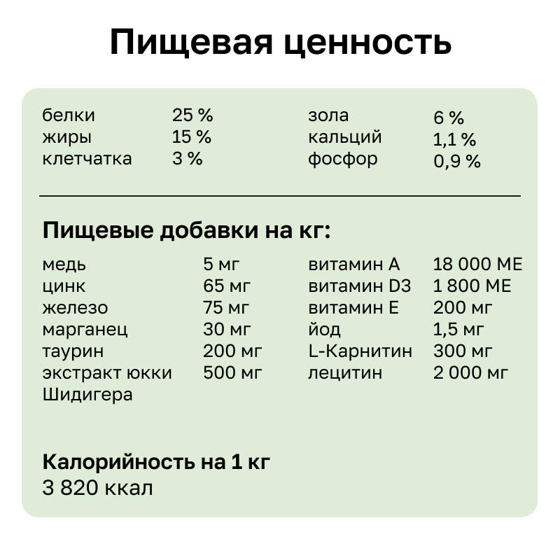 | Витамины | на 1 кг: A (альфа ретинола ацетат) 18000 мг/кг, D3 (холекальциферол) 1800 мг/кг, E (альфа ретинола ацетат) 75 мг/кг |