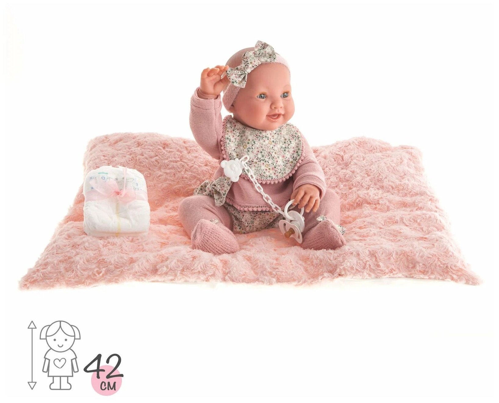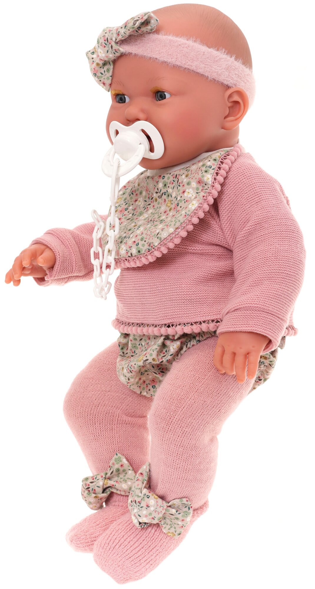 | Комплектация | повязка на голову, слюнявчик, кофточка, колготки, носочки, подушка, подгузник, бутылочка, штанишки, соска |