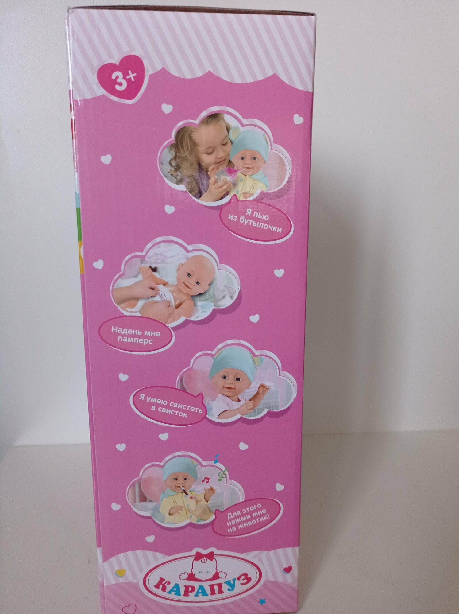 | Отзыв: | Заказала Дочке этого пупса, теперь она ходит счастливая! Купает его, спать укладывает, памперс вечно надевает, снимает. И бегает со свистком, тренирует его) в общем, радости много от пупса, целый день с ним играет.