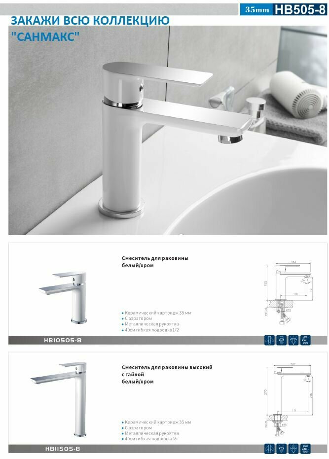 | Комплектация | Смеситель; Гибкая подводка 40см., 1/2" ; Керамический катридж 35мм |