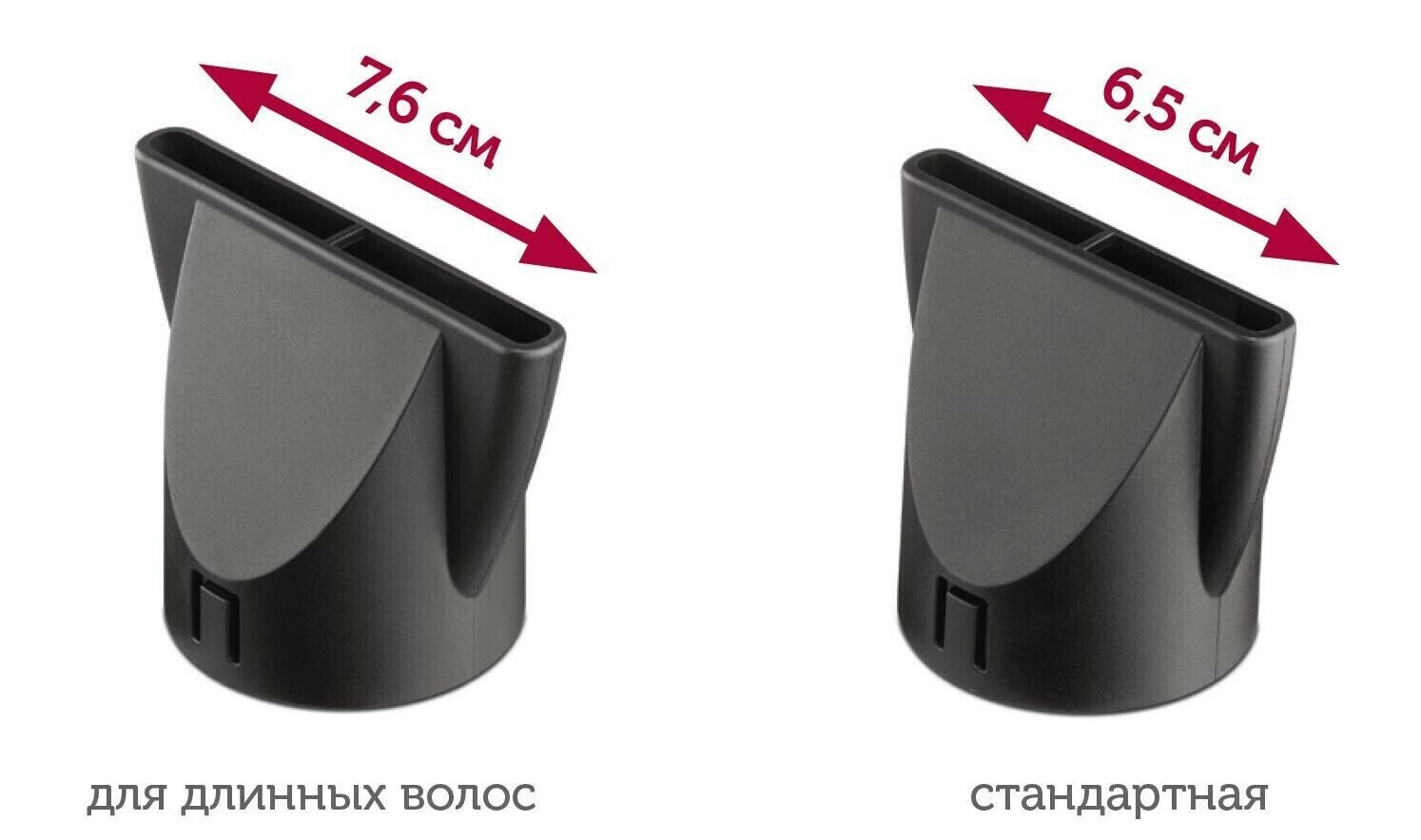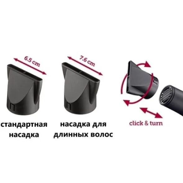 | Подробная комплектация | фен, 2 насадки-концентратора на защелках (стандартная 65 мм и для длинных волос 76 мм) |