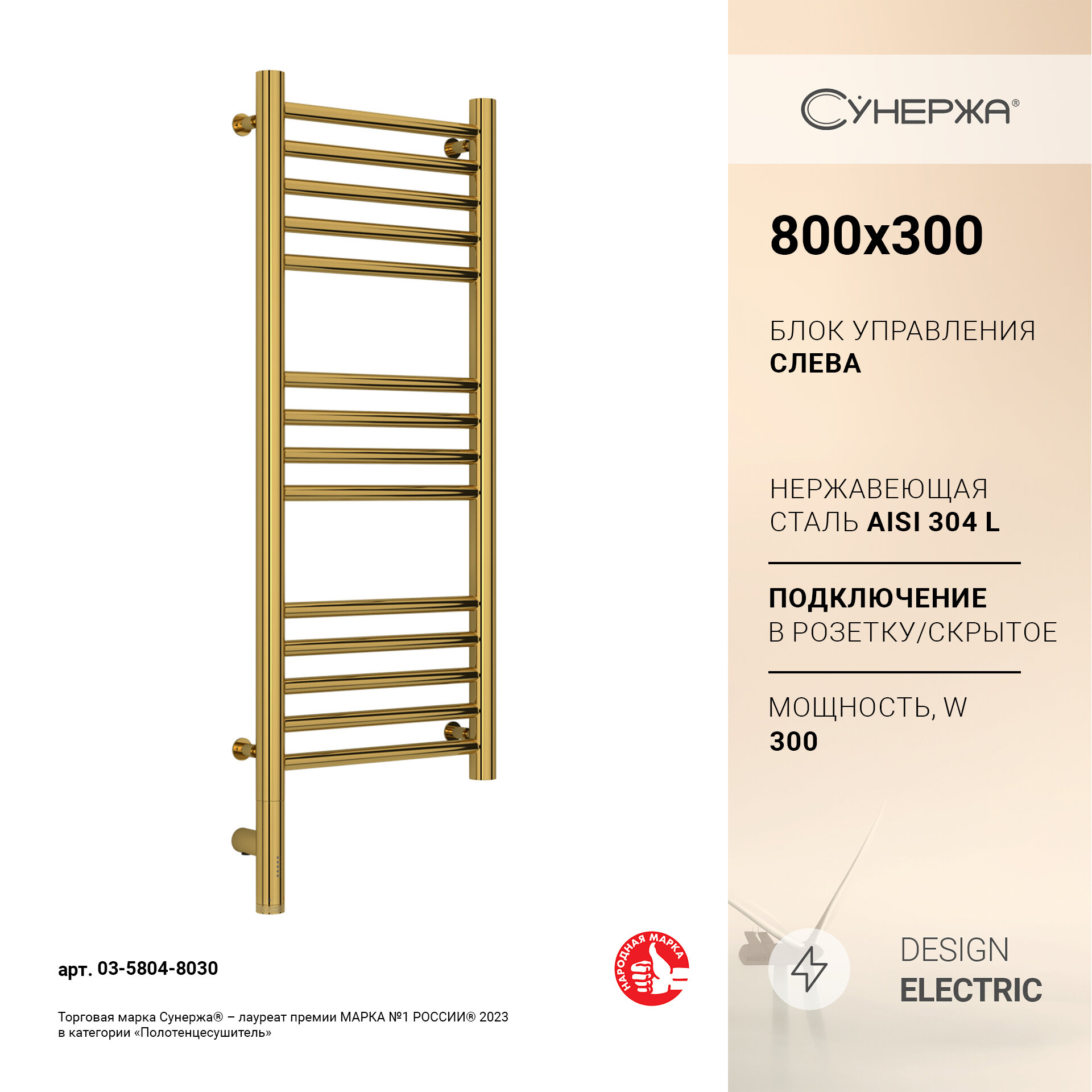 Купить Полотенцесушитель электрический Сунержа Богема 3.0 прямая 800х300 МЭМ левый Золото
