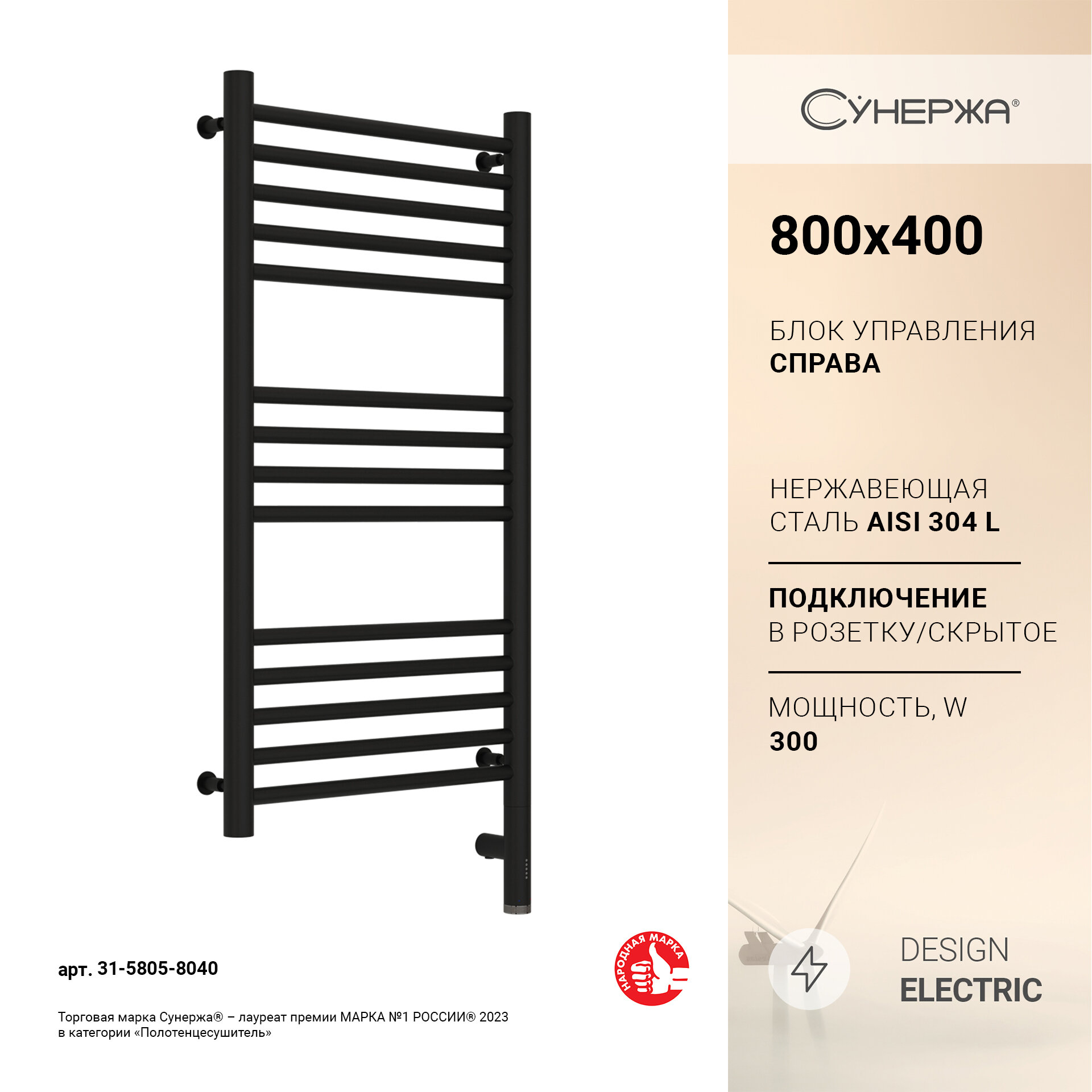 Электрический полотенцесушитель Сунержа Богема 3.0 прямая 800х400 МЭМ правый, арт. 00-5805-8040