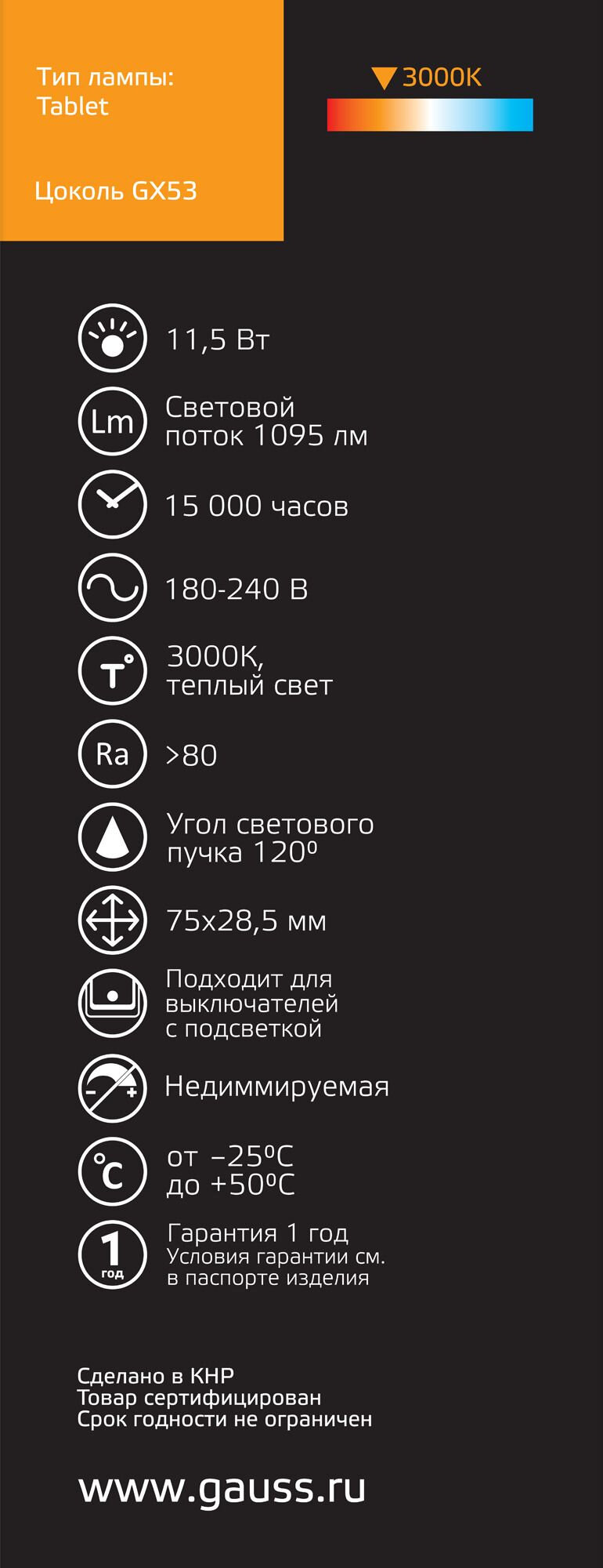 Лампа светодиодная gauss 20849112, GX53, 11.5 Вт, 3000 К