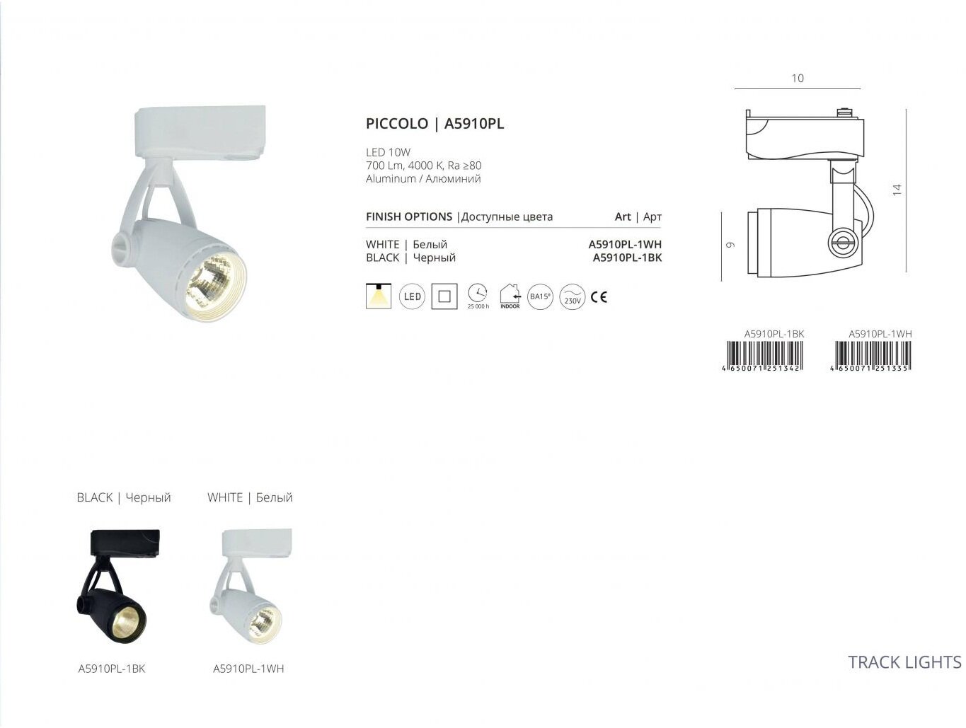 Трековый светильник A5910PL-1BK 10W 4000K