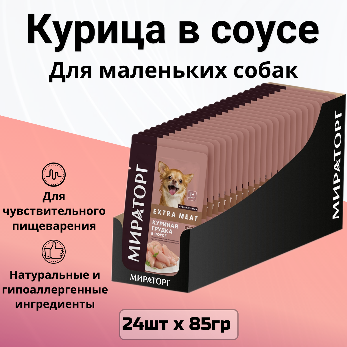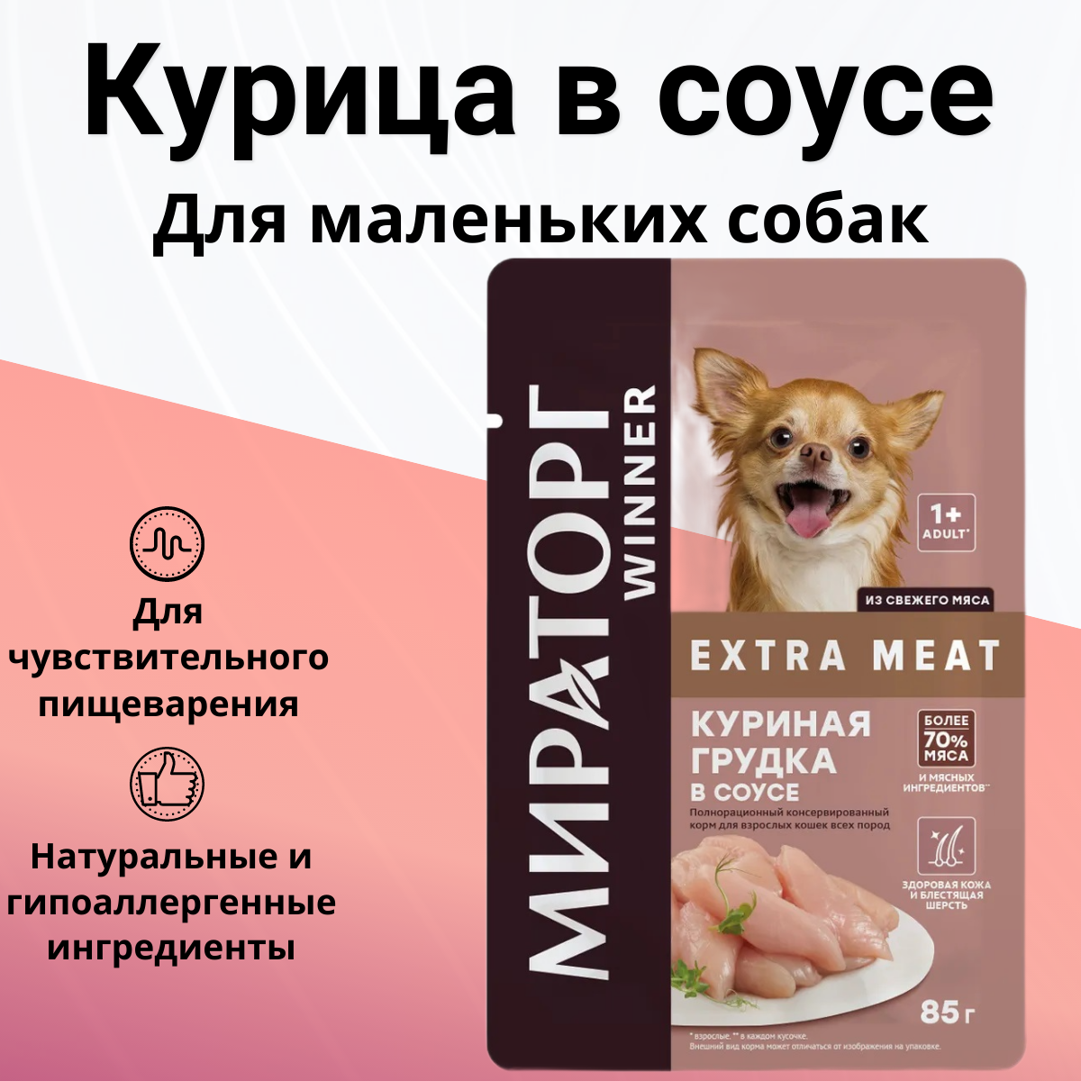 Корм влажный Мираторг EXTRA MEAT куриная грудка в соусе для взрослых собак мелких пород с чувствительным пищеварением, паучи 85г (24шт)