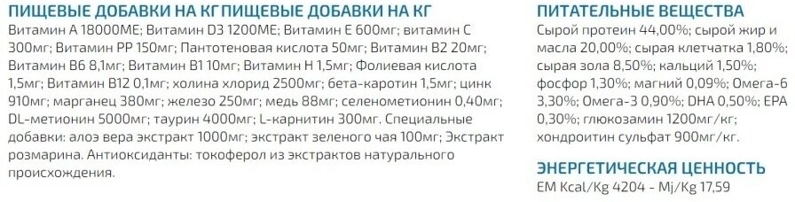 | Пищевая ценность | сырой протеин 44.00%, сырой жир и масла 20.00%, сырая клетчатка 1.80%, сырая зола 8.50%, кальций 1,50%, фосфор 1.30%, магний 0.09%, Омега-6 3.30%, Омега-3 0.90%, DHA 0.50%, EPA 0.30%, глюкозамин 1200 мг/кг, хондроитин сульфат 900 мг/кг |