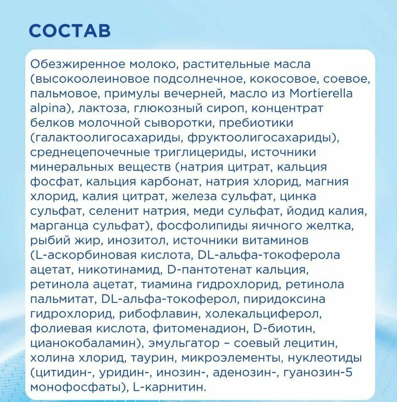 | Состав | обезжиренное молоко, растительные масла (высокоолеиновое подсолнечное, кокосовое, соевое, пальмовое, примулы вечерней, масло из Mortierella alpina), лактоза, глюкозный сироп, концентрат белков молочной сыворотки, пребиотики (галактоолигосахариды, фруктоолигосахариды), среднецепочечные триглицериды, источники минеральных веществ (натрия цитрат, кальция фосфат, кальция карбонат, натрия хлорид, магния хлорид, калия цитрат, железа сульфат, цинка сульфат, селенит натрия, меди сульфат, йодид калия, марганца сульфат), фосфолипиды яичного желтка, рыбий жир, инозитол, источники витаминов (L-аскорбиновая кислота, DL-альфа-токоферола ацетат, никотинамид, D-пантотенат кальция, ретинола ацетат, тиамина гидрохлорид, ретинола пальмитат, DL-альфа-токоферол, пиридоксина гидрохлорид, рибофлавин, холекальциферол, фолиевая кислота, фитоменадион, D-биотин, цианокобаламин), эмульгатор – соевый лецитин, холина хлорид, таурин, микроэлементы, нуклеотиды (цитидин-, уридин-, инозин-, аденозин-, гуанозин-5 монофосфаты), L-карнитин |