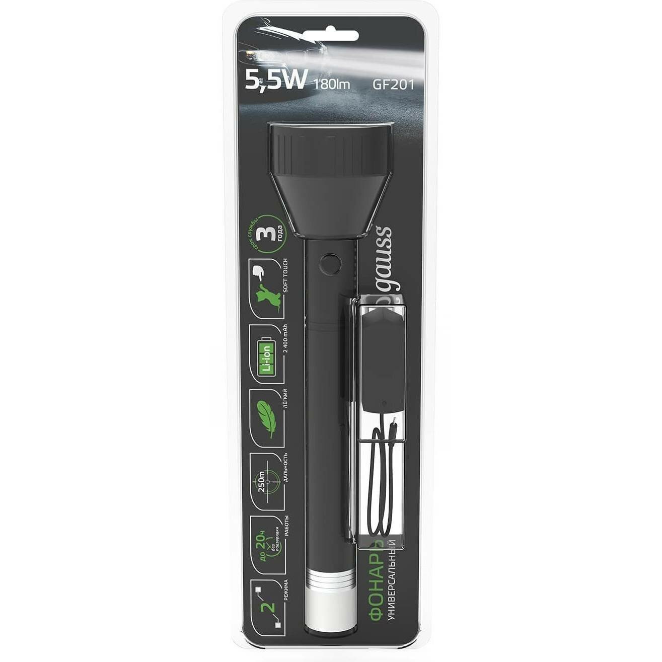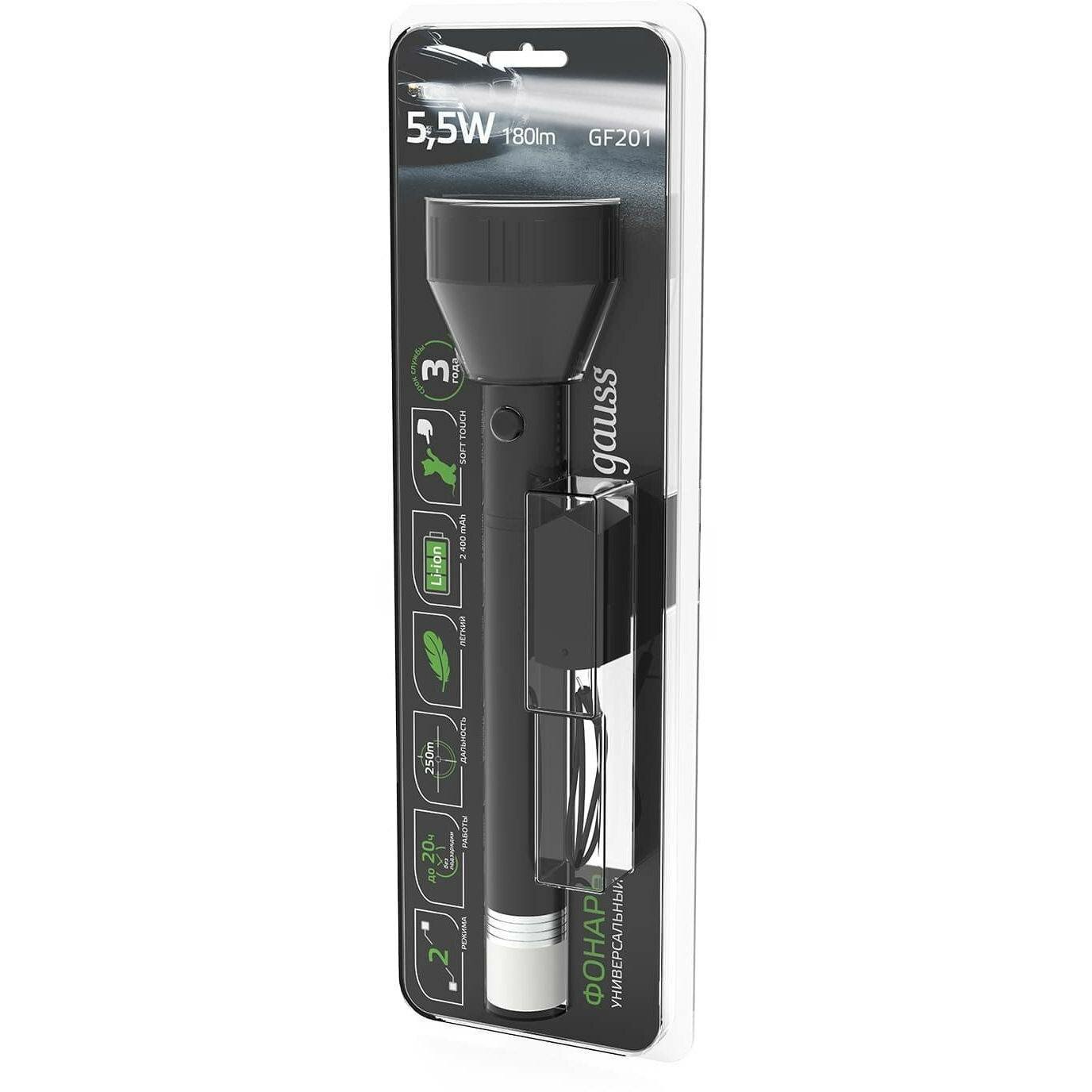Ручной фонарь Gauss модель GFL201 5.5W 180lm Li-ion 2400mAh LED 1/10/40 GF201