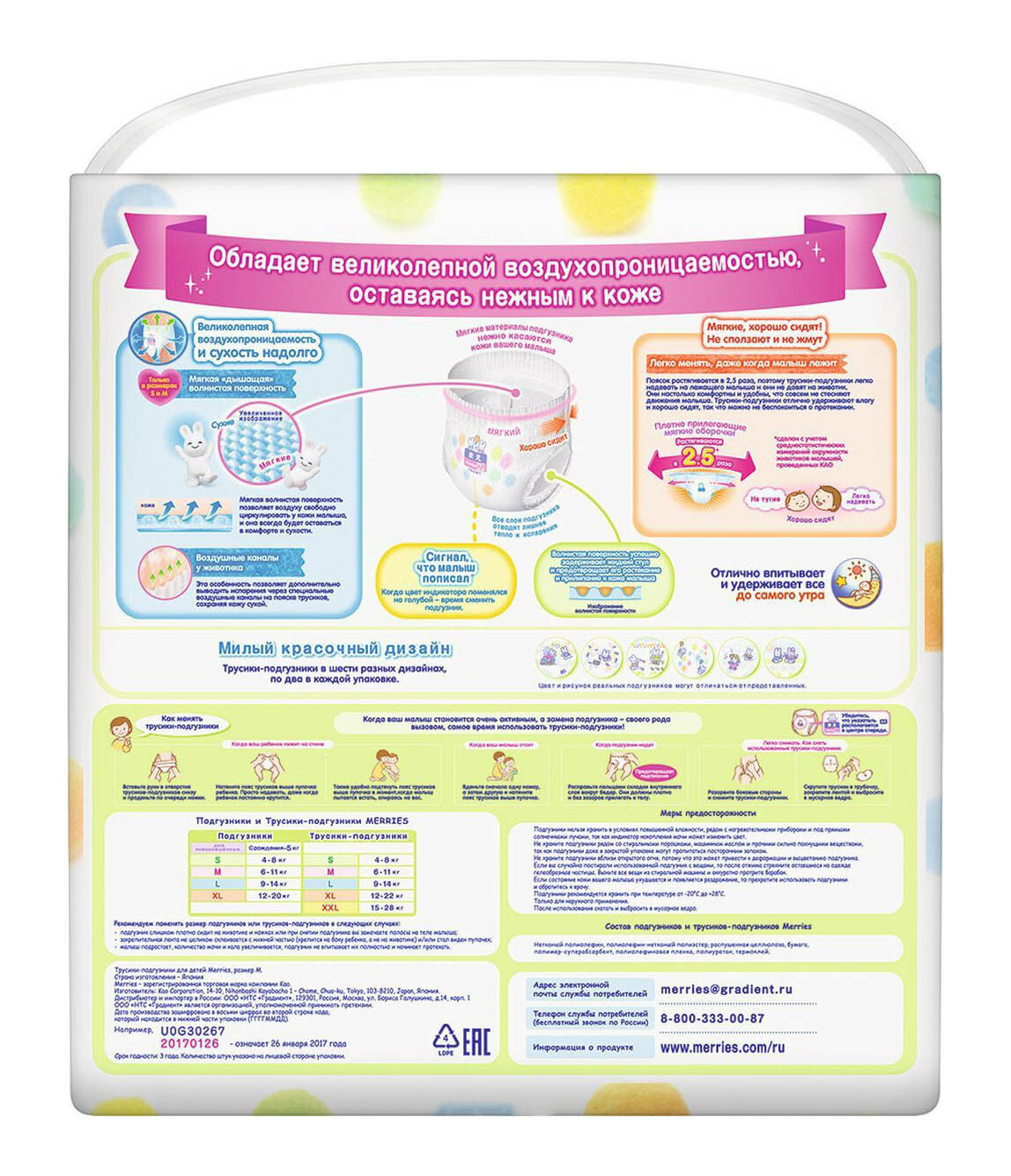 | Отзыв: | Мы пользуемся М с 5 кг(3 месяца), нам сидел хорошо, сейчас ближе к 7 так же сидит отлично, протекает крайне редко( если переполнился). Теперь лежат 2 пачки обычных подгузников в размере M, и не знаю что с ними делать(купила зря), так как после трусиков уже не наденешь ребёнку, другой уровень комфорта, трусики удобнее.
