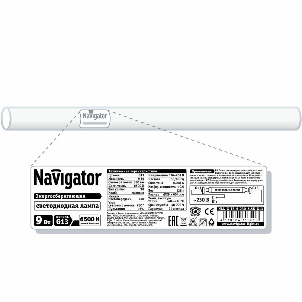 Купить Лампа светодиодная 71 301 NLL-G-T8-9-230-6.5K-G13 9Вт линейная 6500К холод. бел. G13 830лм 176-264В (аналог 18Вт 600мм) Navigator 71301