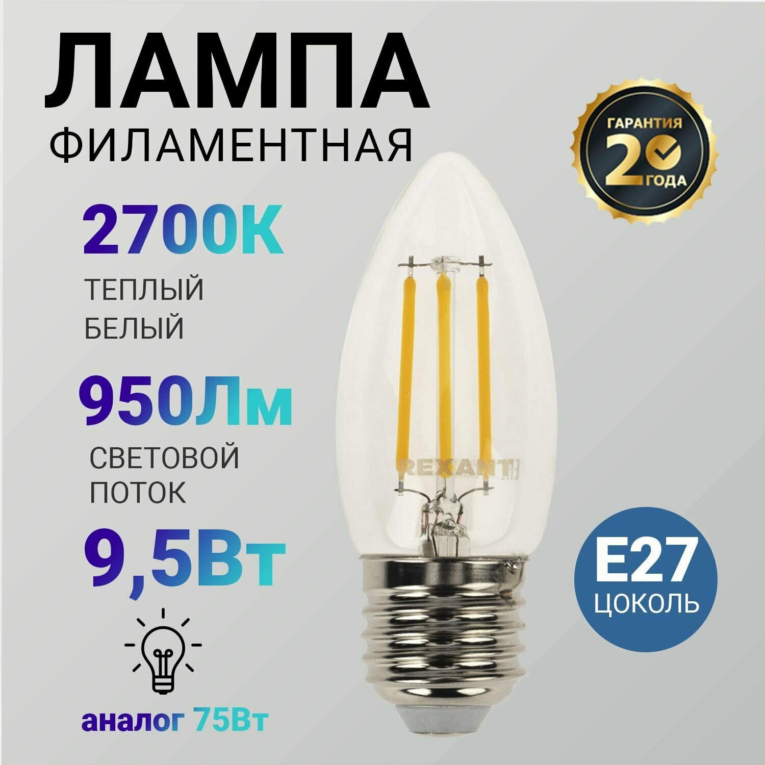Лампа филаментная Rexant Свеча CN35, 9.5 Вт, 950 Лм, 2700K, E27 в прозрачной колбе