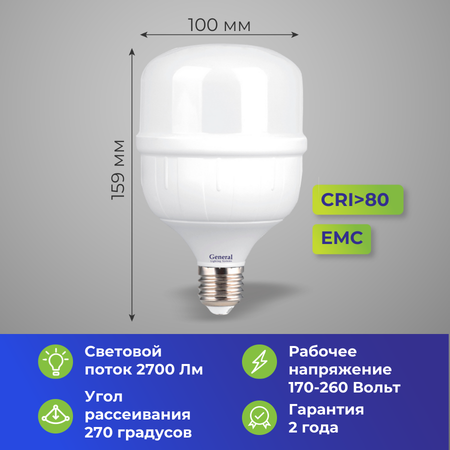 Светодиодные лампы, General, 1 шт., Мощность 30 Вт, Цоколь E27, Дневной свет