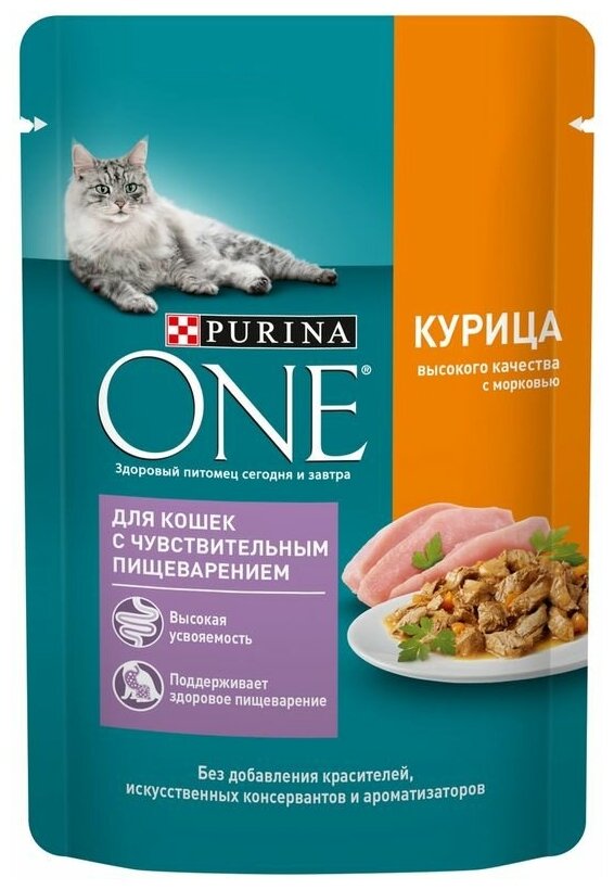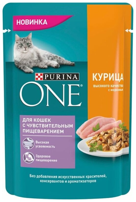 Корм для кошек PURINA ONE с чувствительным пищеварением, курица с морковью пауч 75г (упаковка - 26 шт)