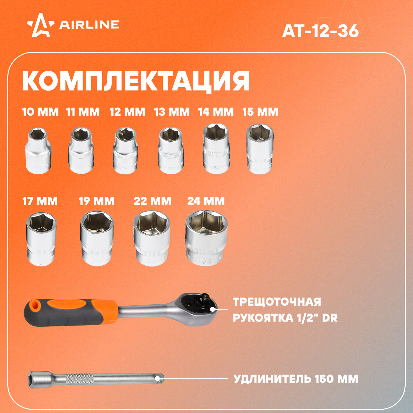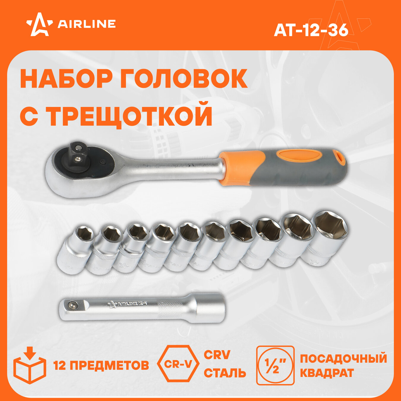 Купить Набор головок с трещоткой 1/2" DR 72Т 12пр. (10,11,12,13,14,15,17,19,22,24мм, удлинитель 125мм) AT-12-36 AIRLINE