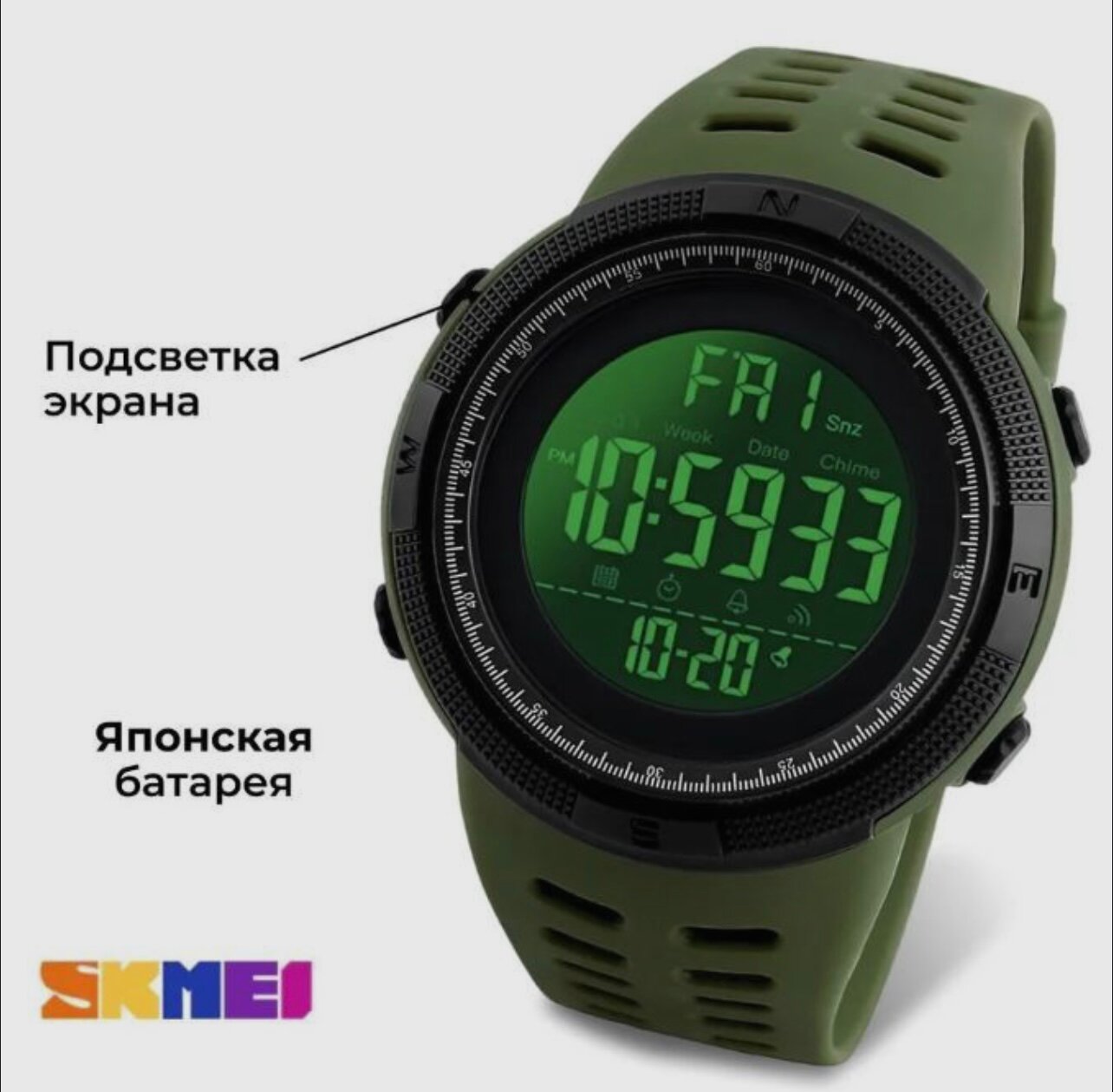 Часы мужские SKMEI 1251, водонепроницаемые, цвет зеленый милитари. Часы электронные.