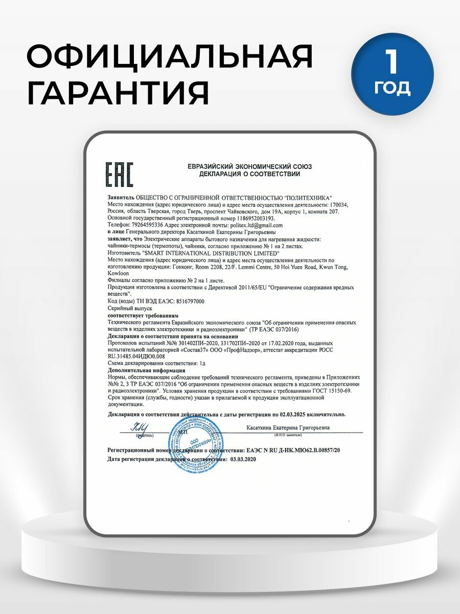 | Минусы: | Производитель явно сэкономил на электрике и пластиковых деталях. Проводки, которые расположены в пластиковой ручке чайника, греются ощутимо, отчего пластик издает характерный запах |