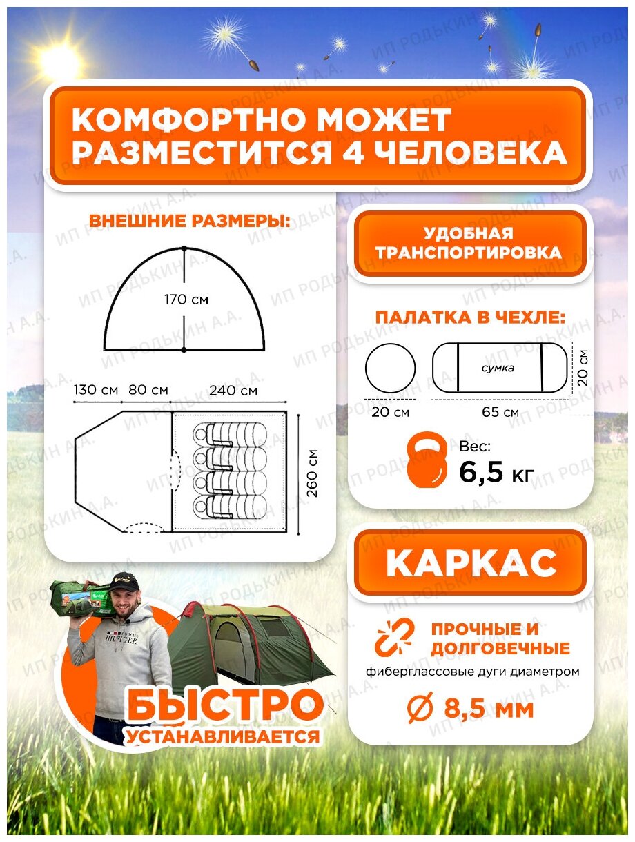 Палатка туристическая 4 местная с тамбуром для туризма отдыха на природе двухслойная MirCamping