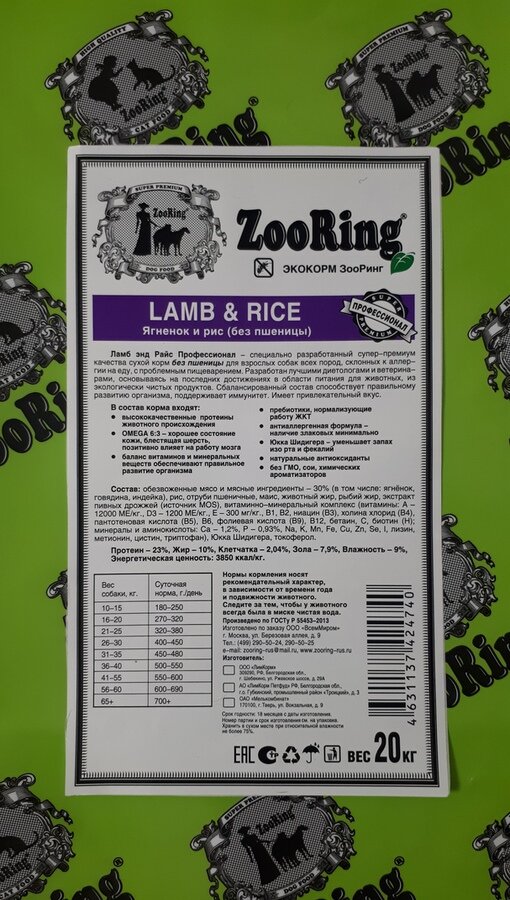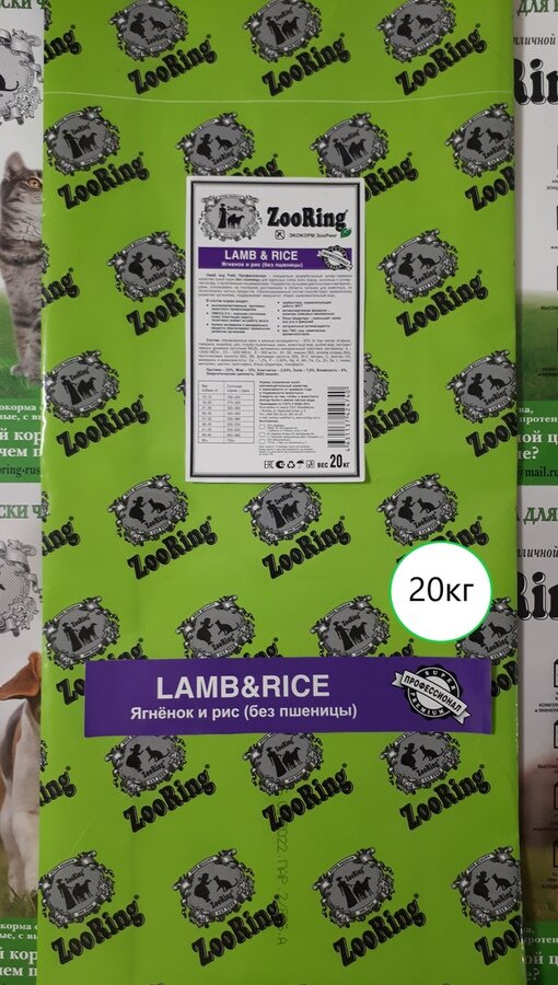 Сухой корм для собак ZooRing ягненок, с рисом 1 шт. х 20 кг