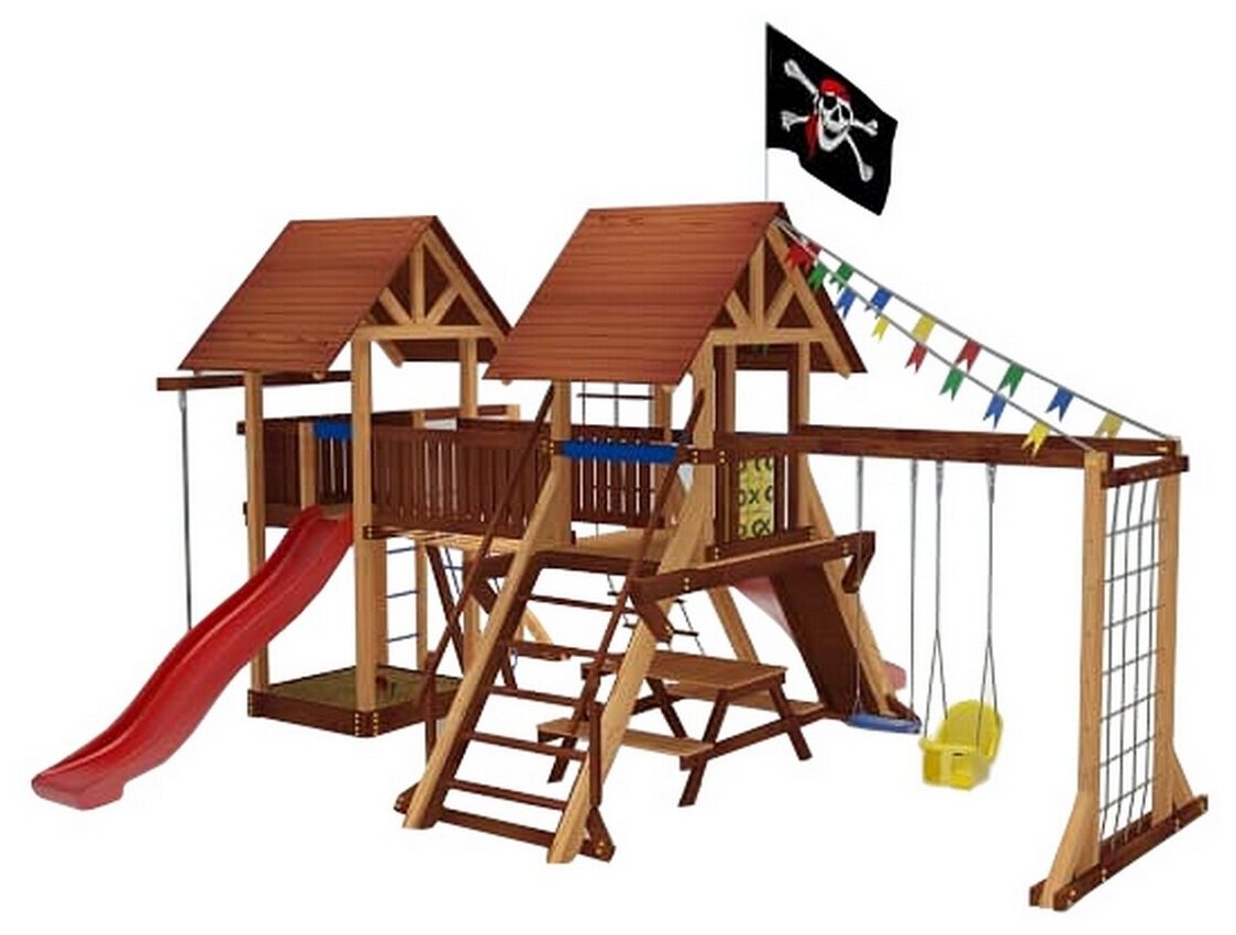 | Комплектация | - игровая башня Люкс (высота платформы 1500 мм); - игровая башня (высота платформы 1500 мм) - горка длиной 300 см (2 шт.); - веревочная лестница; - "Крестики-Нолики"; - гимнастические кольца; - качели "Лодочка"; - качели со спинкой "Люкс"; - деревянная крыша (2 шт.); - сетка-лазалка; - подвесной мостик; - столик с лавками отдельностоящий; - широкая лестница с деревянными ступенями и перилами; - лесница с металическими ступенями; - альпинистская стенка с пластиковыми выступами и канатом; - песочница; - шведская стенка; - турник; - канат; - флажковая гирлянда; - флаг "Веселый Роджер". |