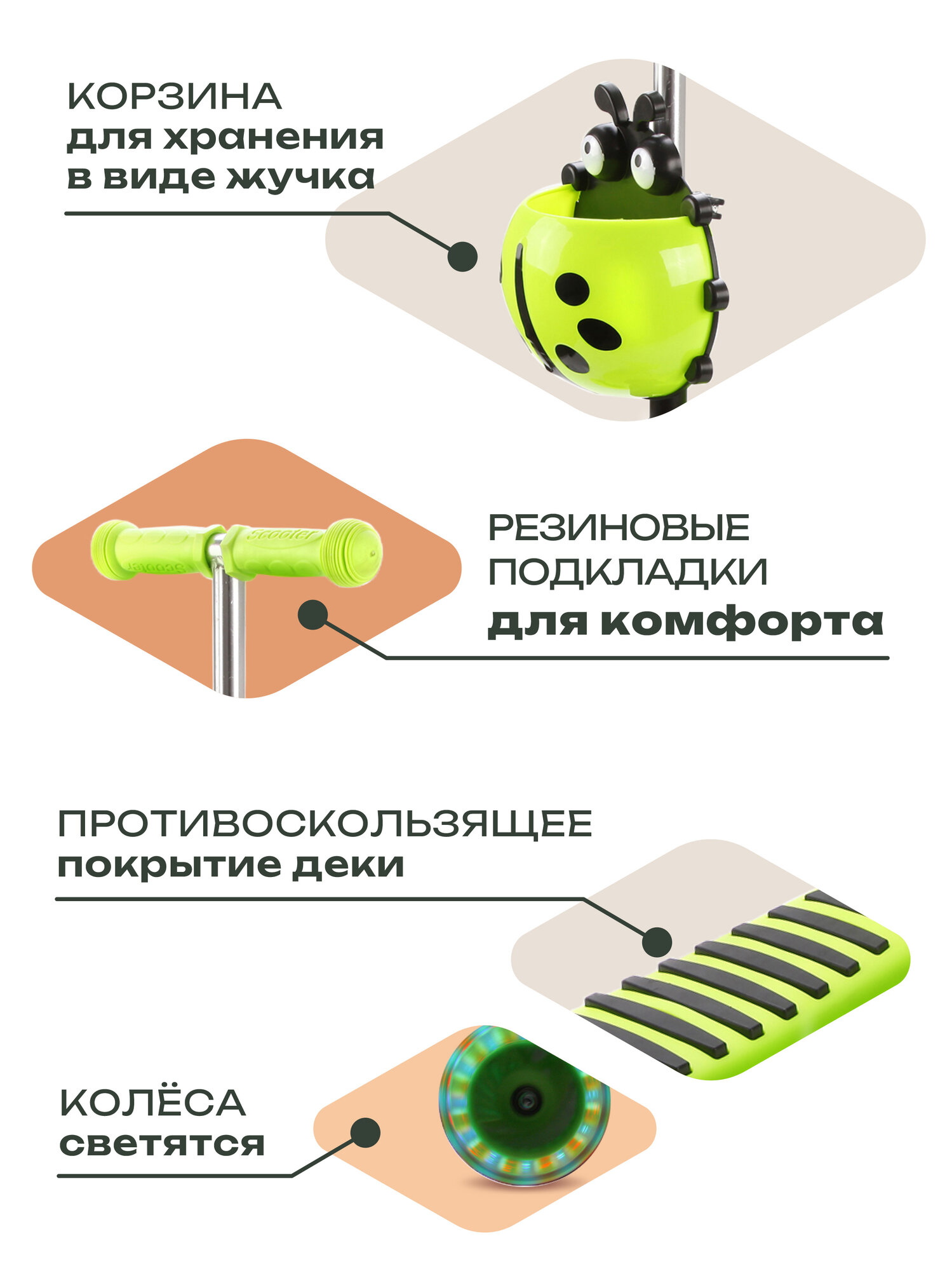 Самокат "Божья коровка" 3 в 1, с подсветкой колес, зеленый Moby Kids 641274 интересное: