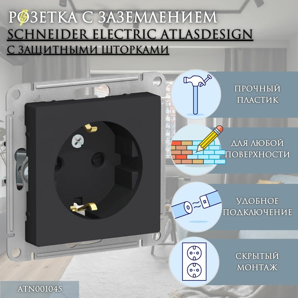 Розетка ATLASDESIGN, скрытый монтаж, с заземлением, со шторками, карбон | код. ATN001045 | Schneider Electric (5шт.в упак.)