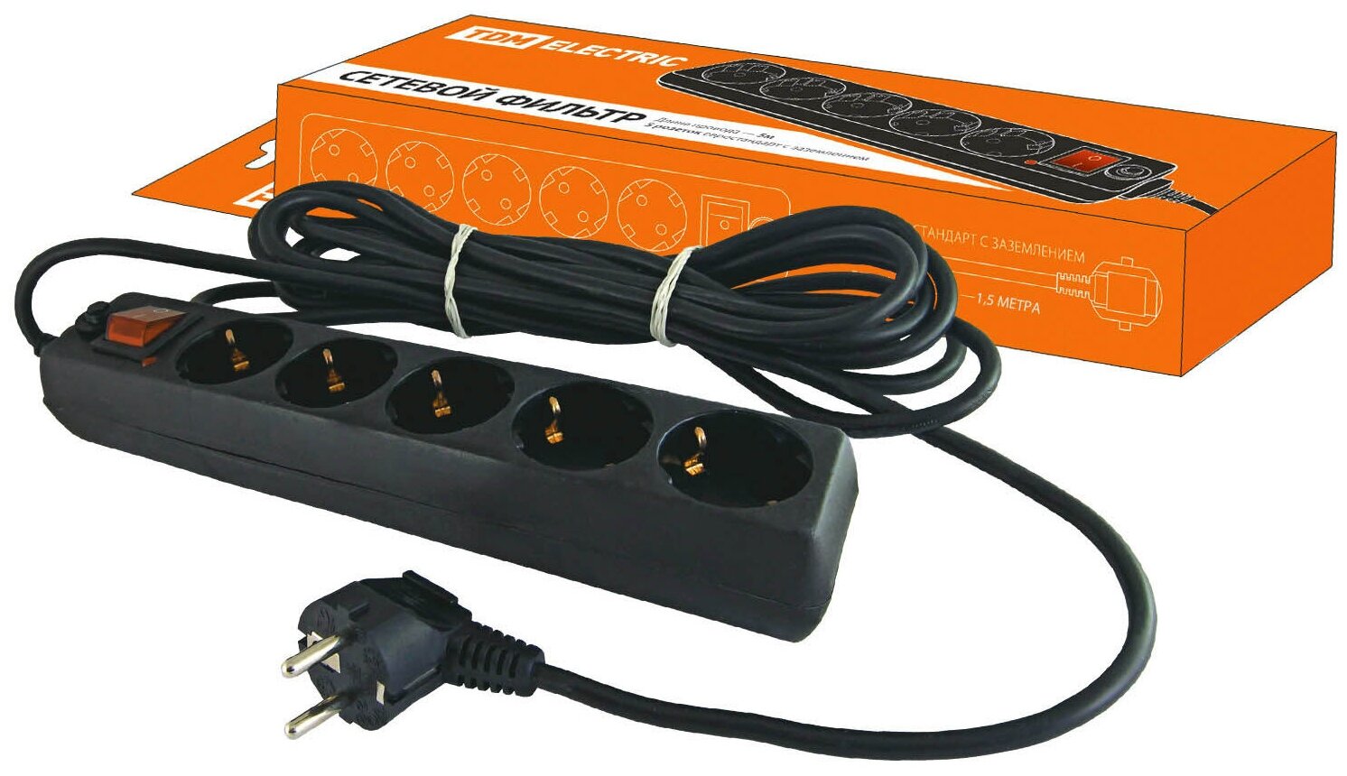 Сетевой фильтр СФ-05В выключатель, 5 гнезд, 1,5 метра, с заземлением, ПВС 3х1мм2 16А/250В черный TDM SQ1304-0001