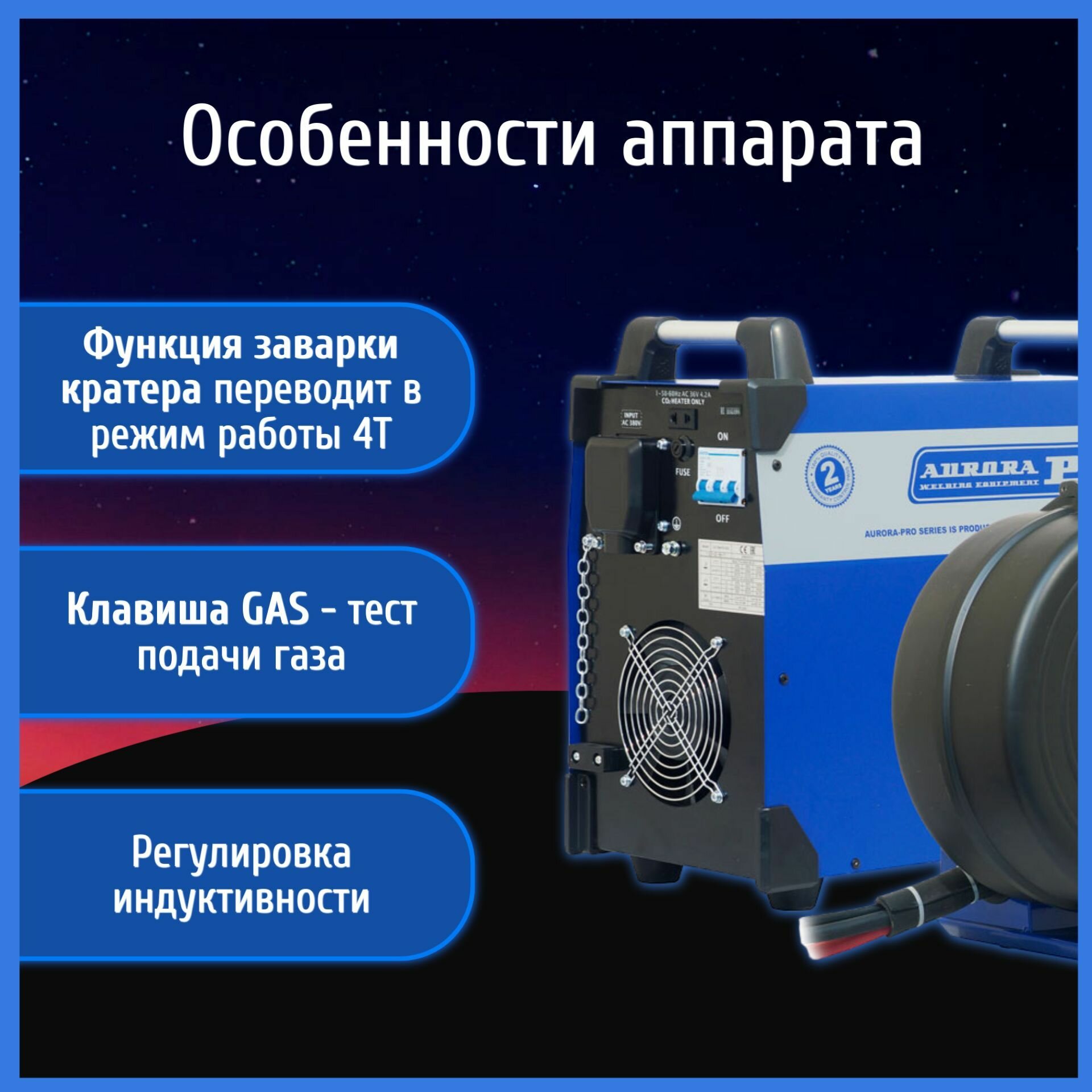 | Дополнительная информация | двухтактный и четырехтактный режим; регулируемый режим заварки кратера; возможность смены полярности тока; возможность дополнительного подключения блока жидкостного охлаждения горелки |