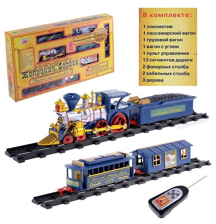 | Дополнительная информация | 1 локомотив (19х8.5х6 см) 1 пассажирский вагон 1 грузовой вагон 1 вагон с углем 1 пульт управления 12 сегметнов дороги 2 фонарных столба 2 кабельных столба 3 дерева Питание игрушки: 4 батарейки 1.5V AA (необходимо докупить отдельно). Питание пульта: 2 батарейки 1.5V AA (необходимо докупить отдельно). |