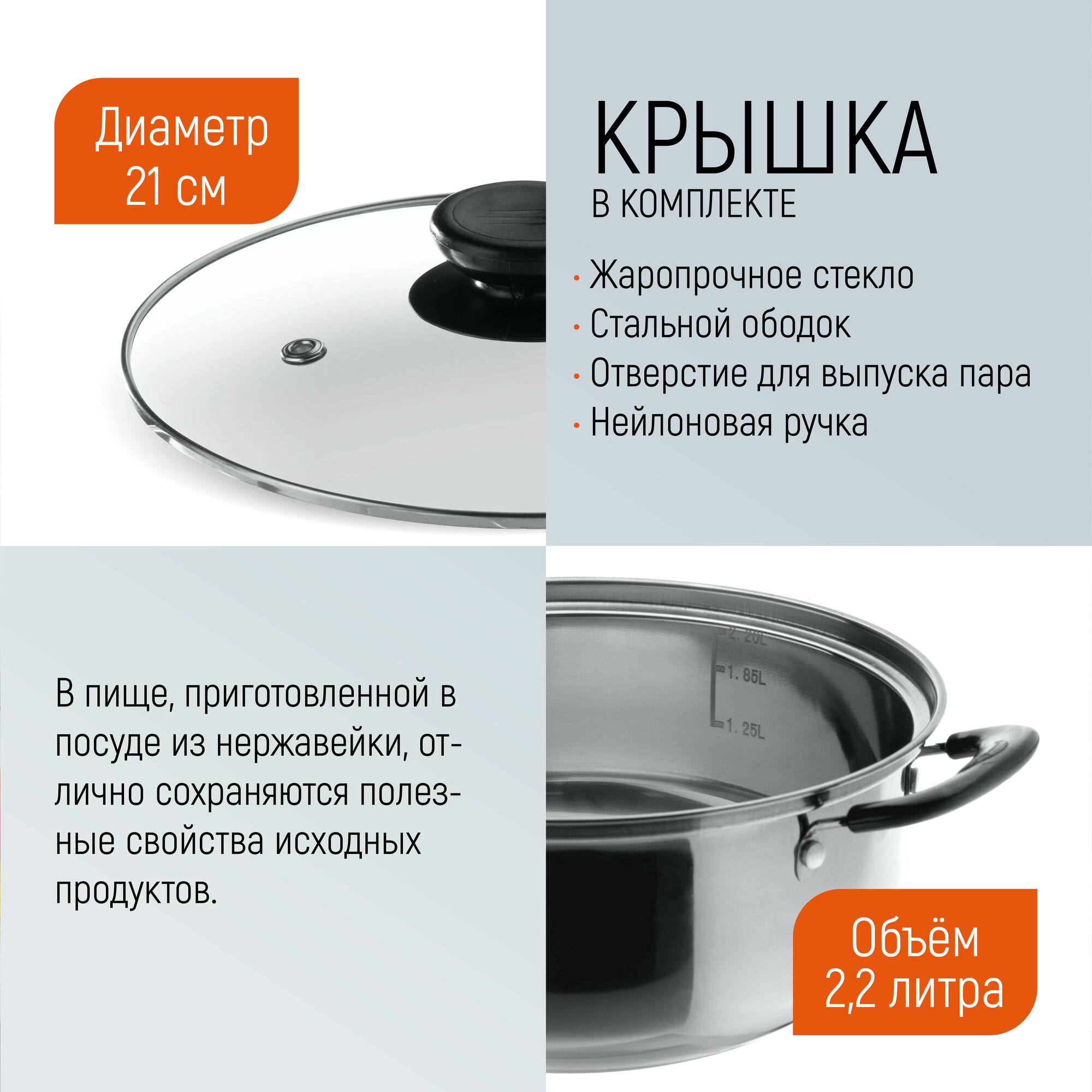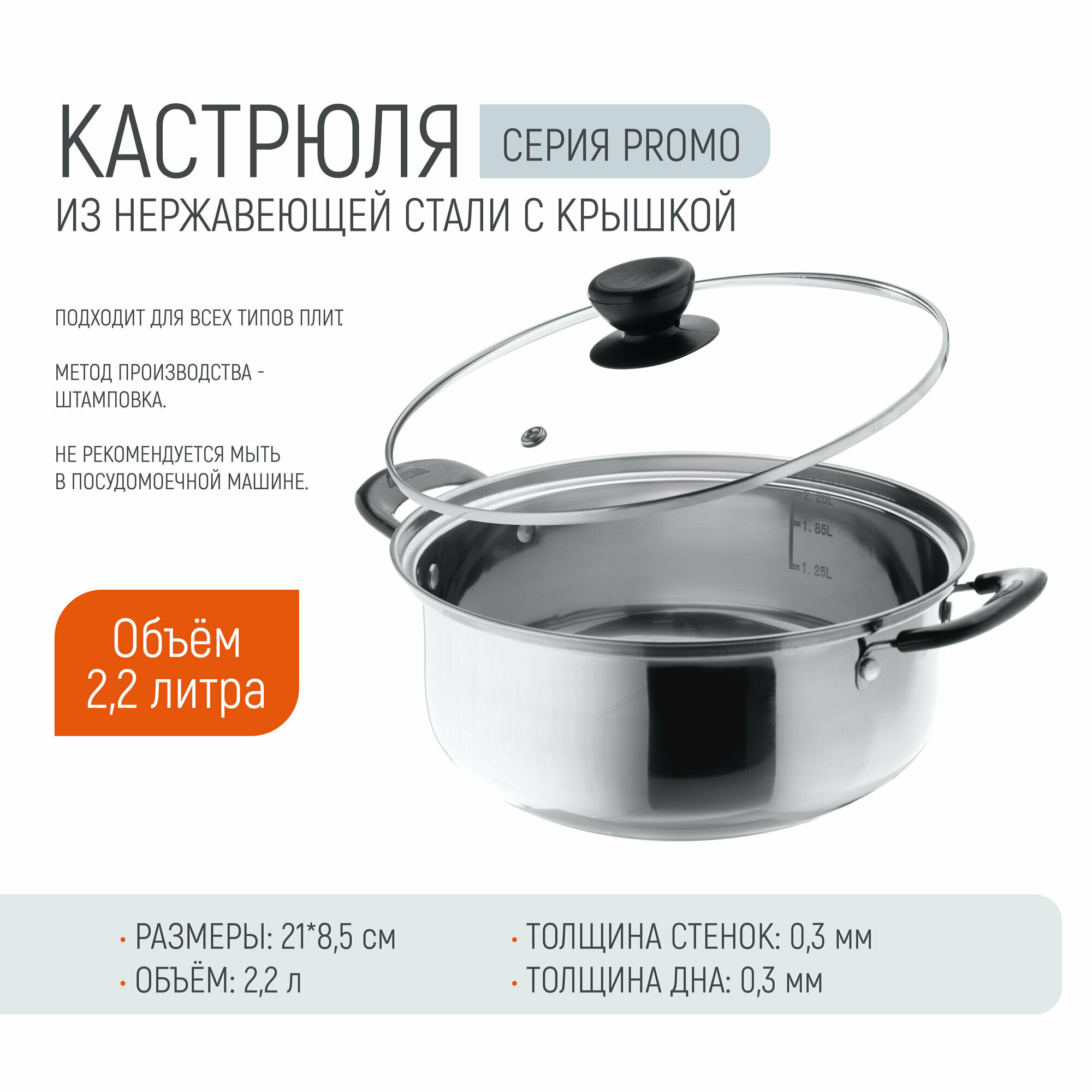 Купить Кастрюля Promo, объем 2,2 л, из нержавеющей стали с крышкой из жаропрочного стекла