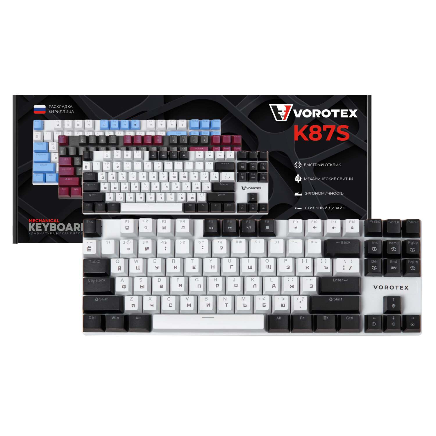 Игровая клавиатура VOROTEX K87S Blue Switch, черный/белый, русская