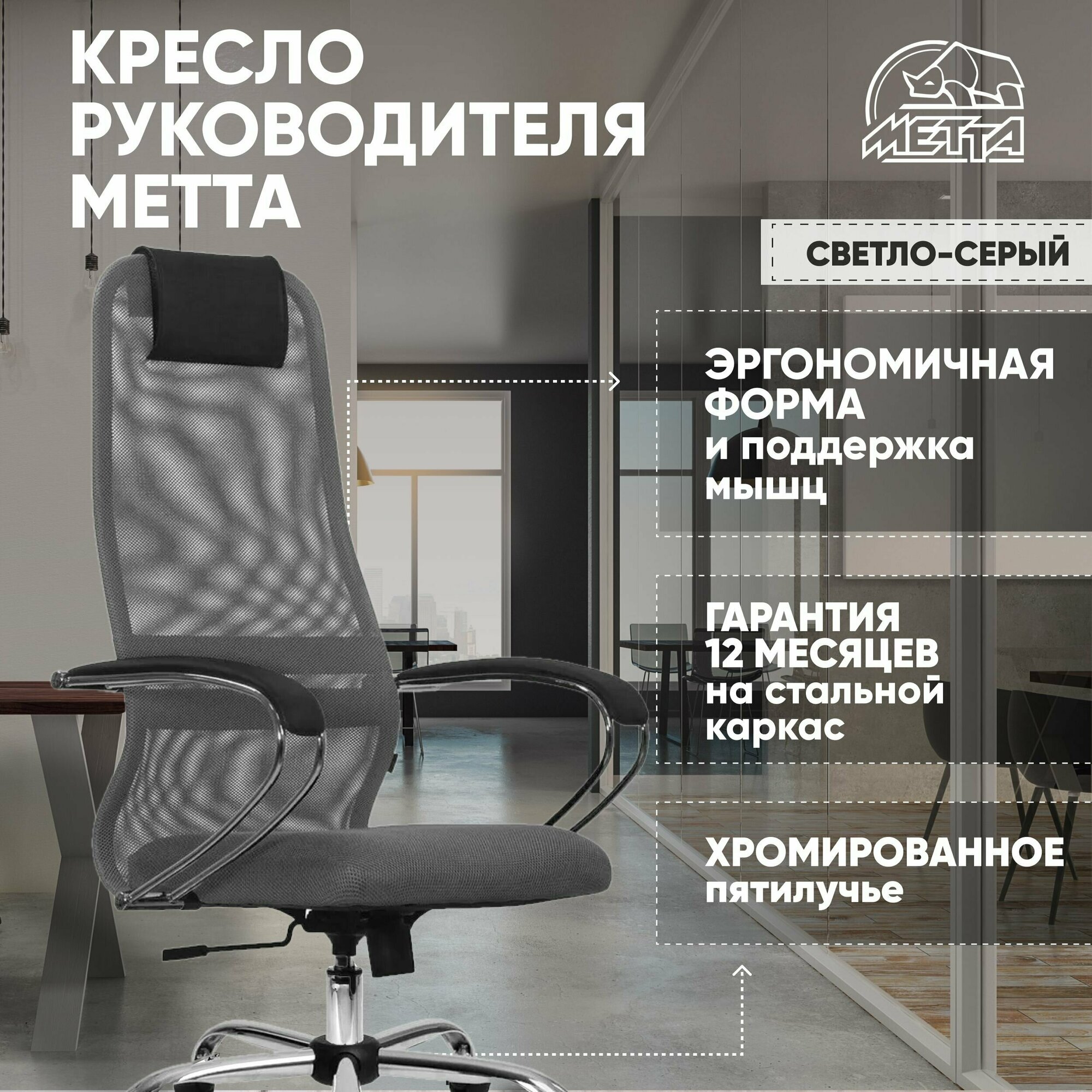Офисное кресло Метта SU-BK-8, светло-серый (Хром, Сетка, игровое компьютерное кресло на колесиках, для школьников, для взрослых)