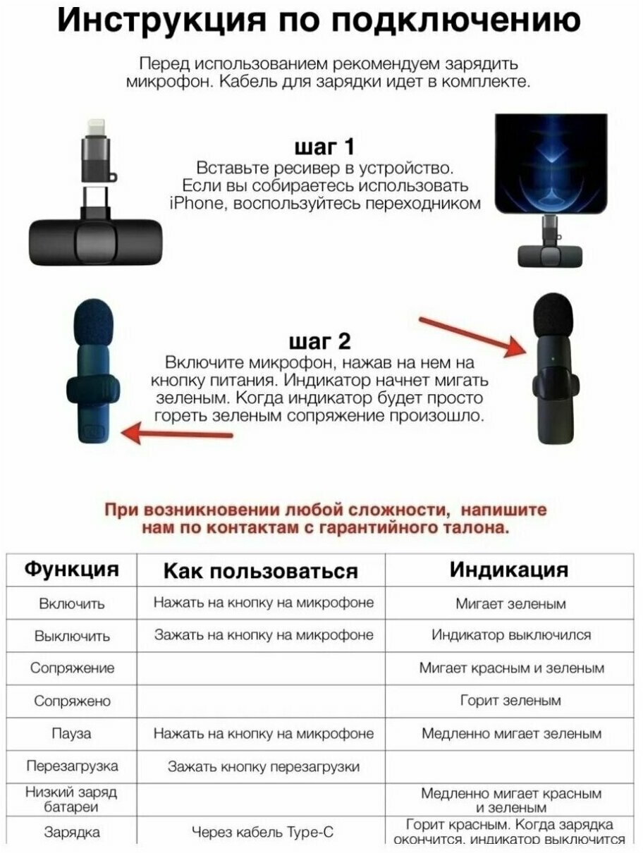 | Подробная комплектация | Микрофон с прищепкой 1шт, переходник Type-C 1шт, переходник Lightning 1шт, упаковка 1шт. |