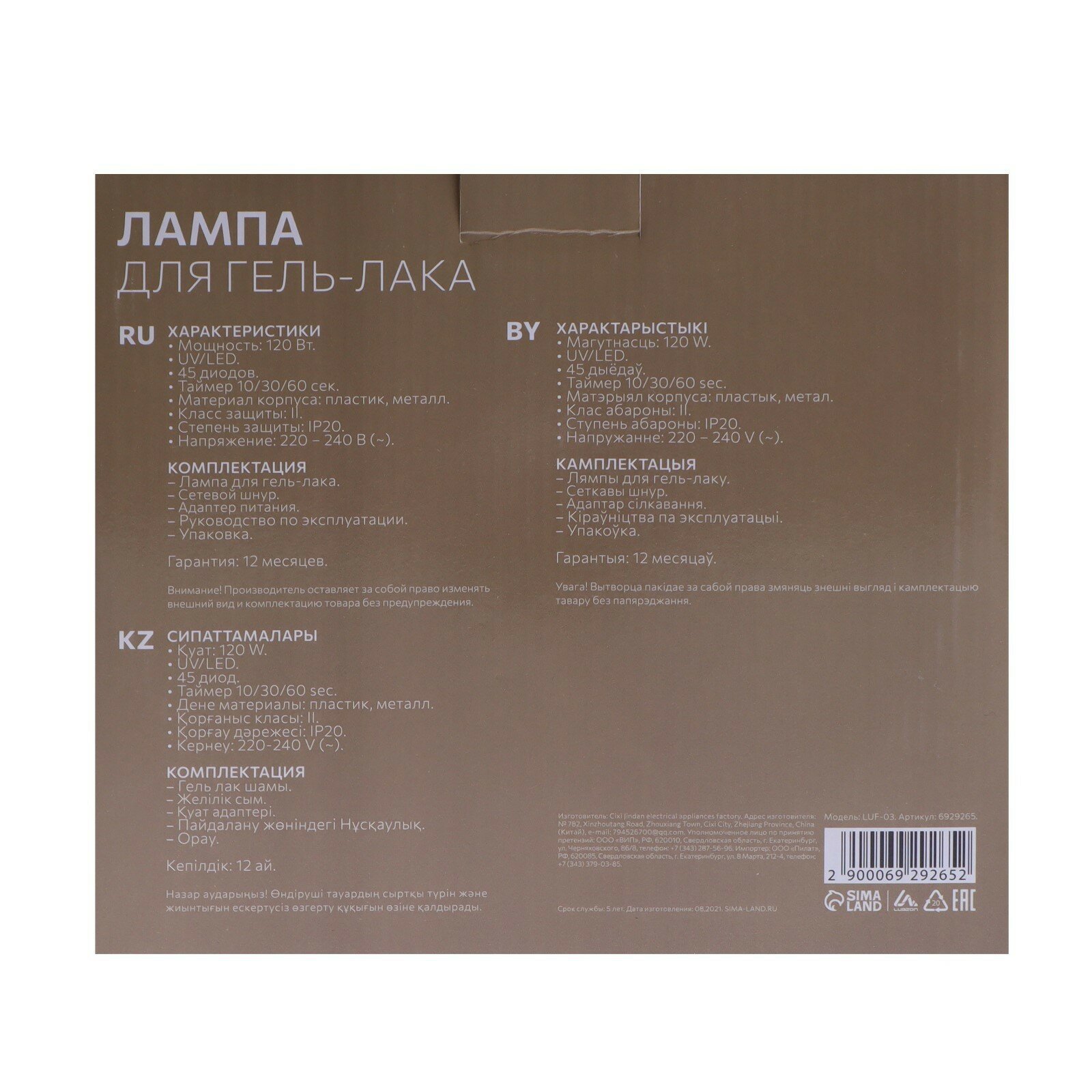 | Тип лампы | LED-UV |