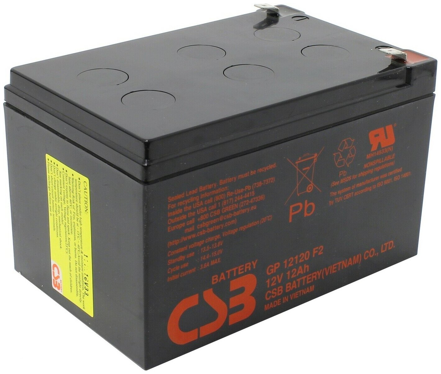 CSB Батарея CSB серия GP, GP12120 F2, напряжение 12В, емкость 12Ач (разряд 20 часов), макс. ток разряда (5 сек.) 180А, ток короткого замыкания 378А, макс. ток заряда 3.6A, свинцово-кислотная типа AGM, клеммы F2, ДxШxВ 151x98x100.3мм., вес 3.67кг., срок сл