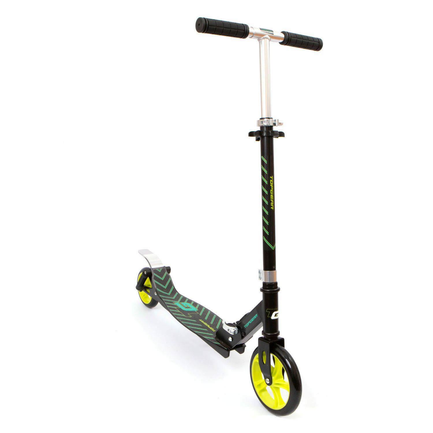 Самокат TOPGEAR 2-х кол.,алюм.,PU кол.180мм,задн.аморт.,ручки складн.TPR,подножка,81*13*91(81)см,г/п до 100кг,черн.-зел.