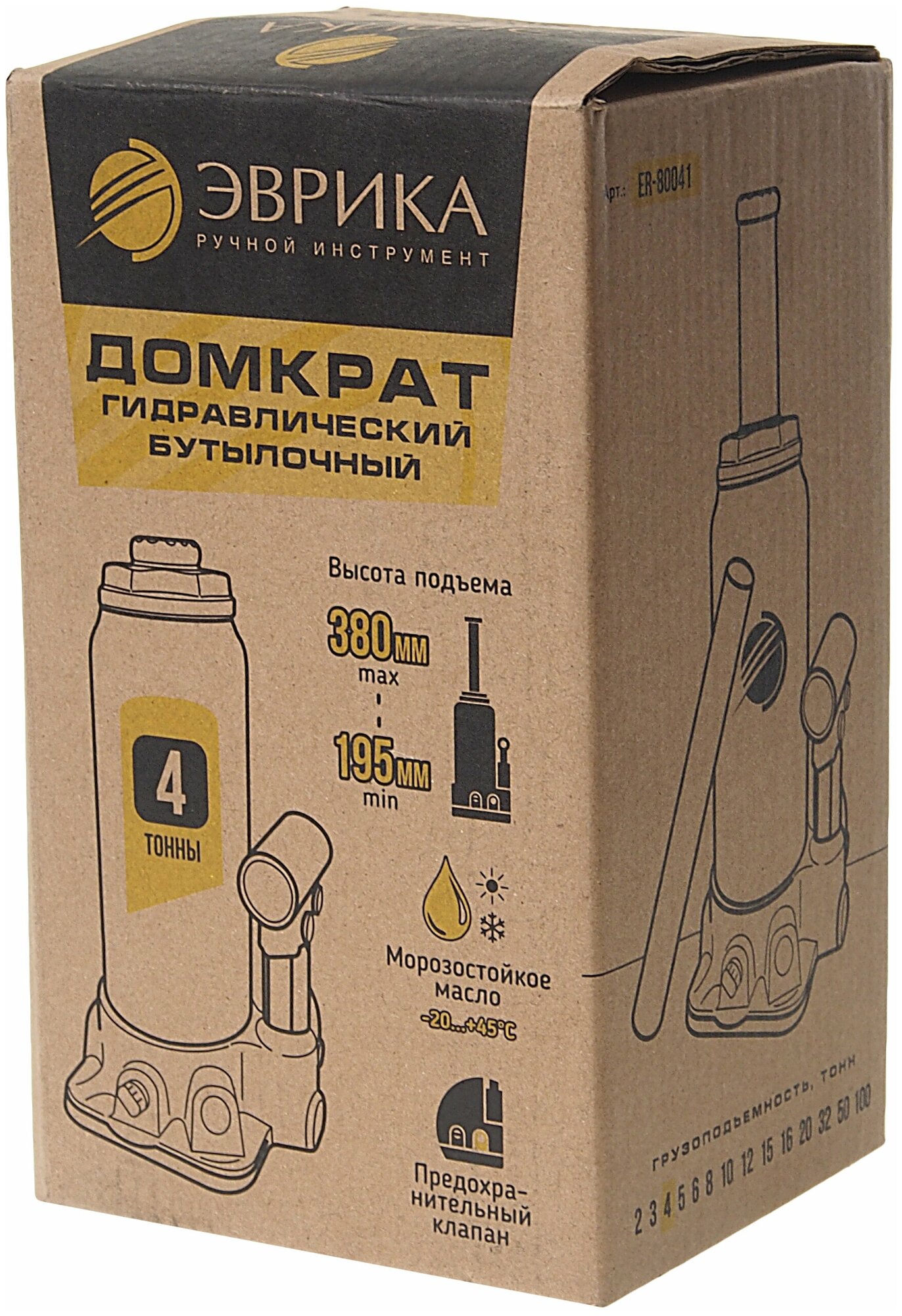Домкрат гидравлический ER-80041 бутылочный с клапаном 4т, ремкомплект (выс. подъема 195-380мм) эврика