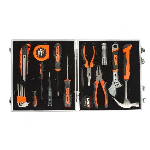 | Дополнительная информация | Комплектация * Набор шестигранных ключей - 5 шт; Технический нож; Рулетка 3 м; Цифровой детектор напряжения; Плоская и крестовая отвертки 3х75 мм - 2 шт; Плоская и крестовая отвертки 6х100 мм - 2 шт; Длинногубцы; Плоскогубцы; Фонарик; Молоток-гвоздодер 0,25 кг; Разводной ключ; Пинцет; Изолента; Алюминиевый кейс. |