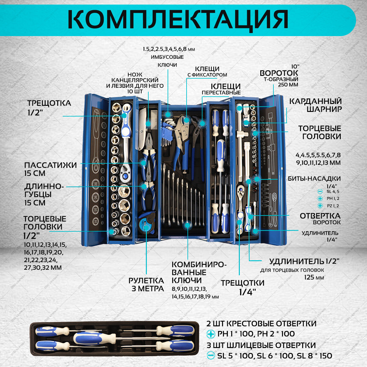 | Аксессуары в комплекте | лезвия для ножа / нож / рулетка / шарнир карданный для головок / Отвертки крестовые / Удлинитель Т-образный с плавающей головкой / Удлинитель / |