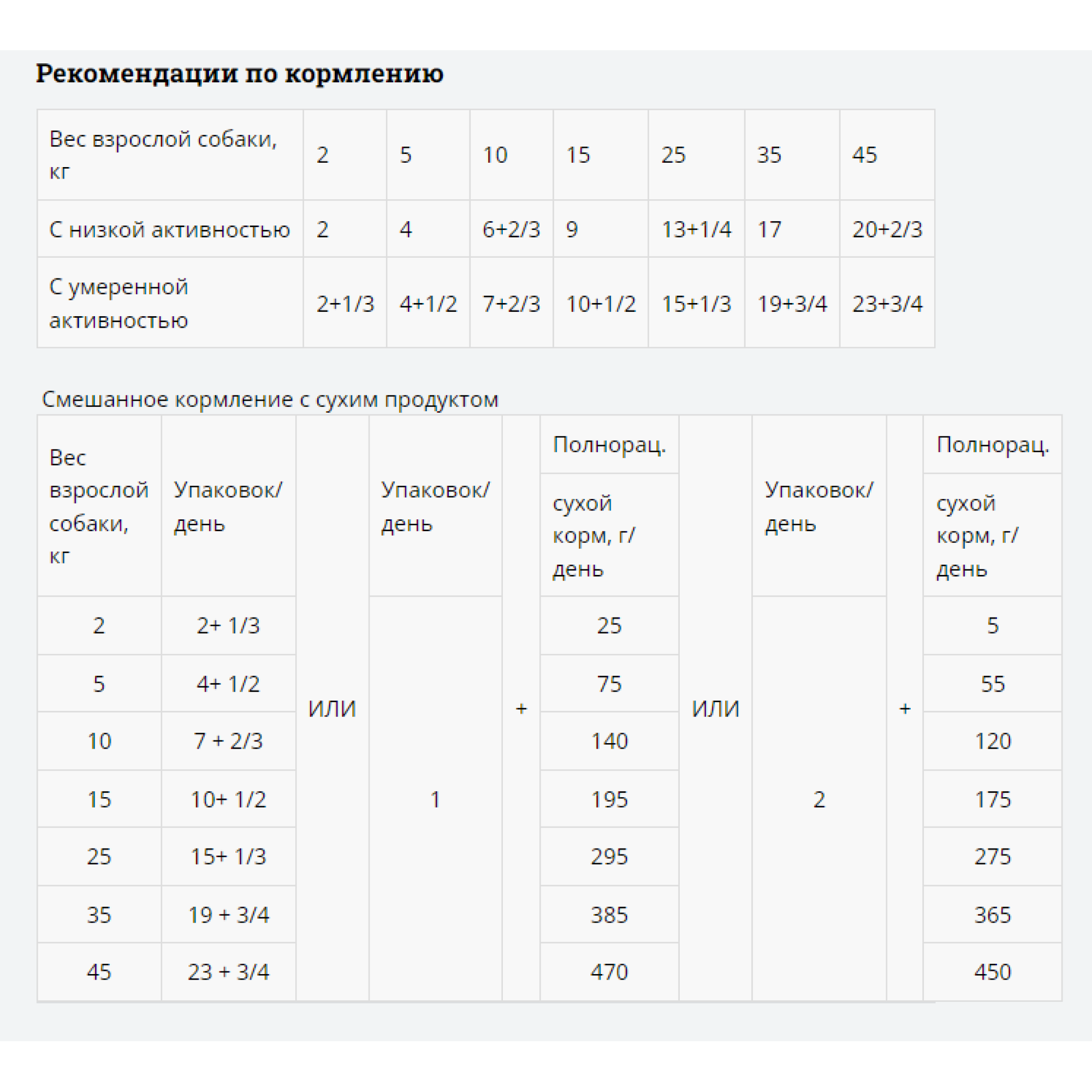 | Дозировка | вес 2 кг - 2+1/3 упаковки в день; вес 5 кг - 4+1/2 упаковки в день; вес 10 кг - 7+2/3 упаковки в день; вес 15 кг - 10+1/2 упаковки в день; вес 25 кг - 15+1/3 упаковки в день; вес 35 кг - 19+3/4 упаковки в день; вес 45 кг -23+3/4 упаковки в день |