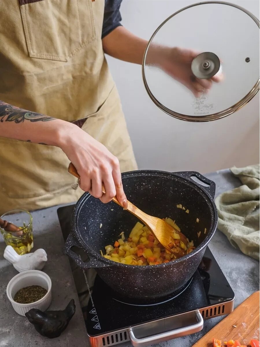 | Минусы: | Ручки ничем не покрыты поэтому без прихватки горячую кастрюлю не возьмешь, но это для того чтобы ее можно было использовать в духовке. |