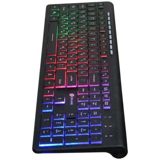 | Плюсы: | Неплохое соотношение цены с возможностями, внешним видом и качеством. Современный минималистичный вид. 3 режима подсветки - 1. Полный круг цветов от зелёного к синему, 2. От малинового к зелёному через синий, и 3. Лимонный-фиолетовый-бирюзовый. Присутствуют дополнительные резиновые клавиши - громкость, отключение звука, управление проигрыванием мультимедиа и прочее. |