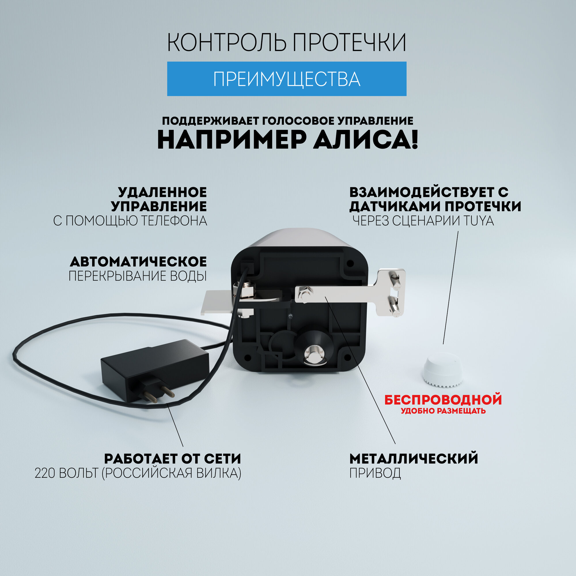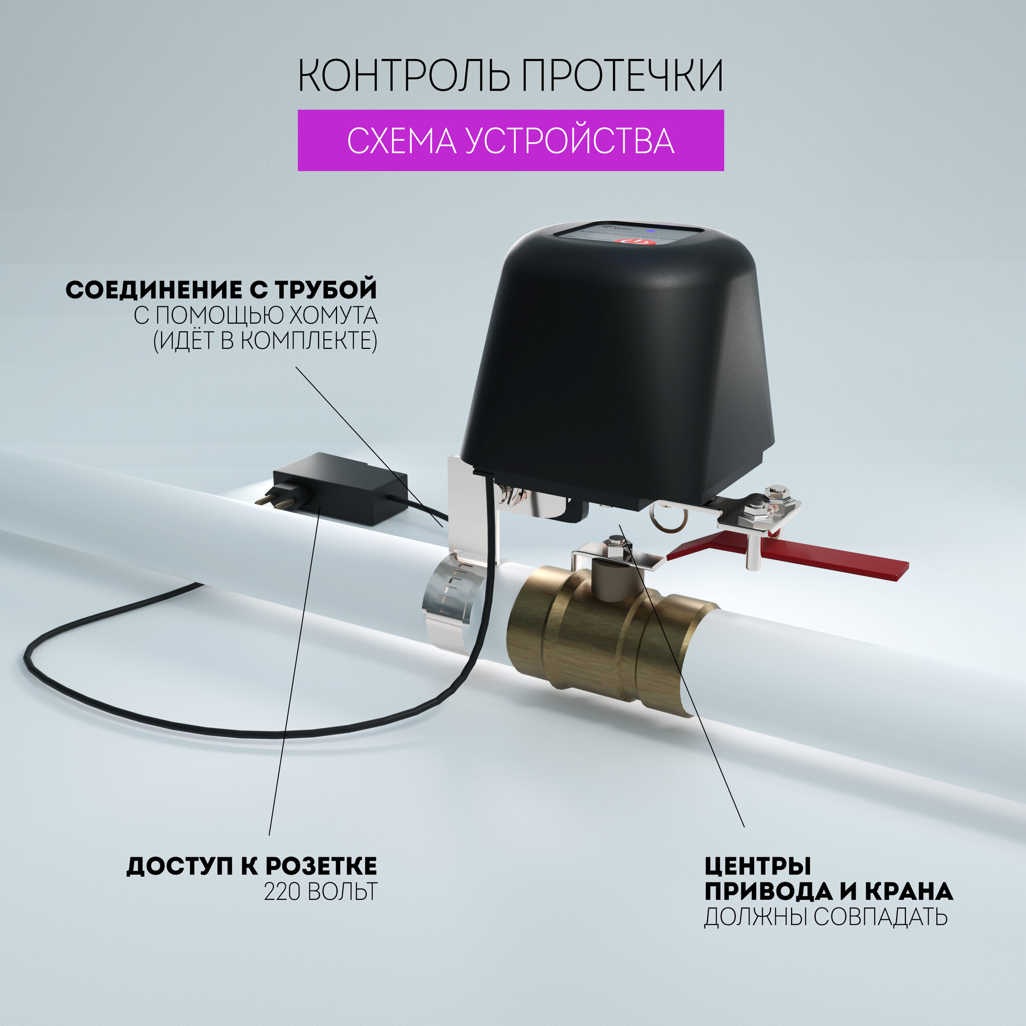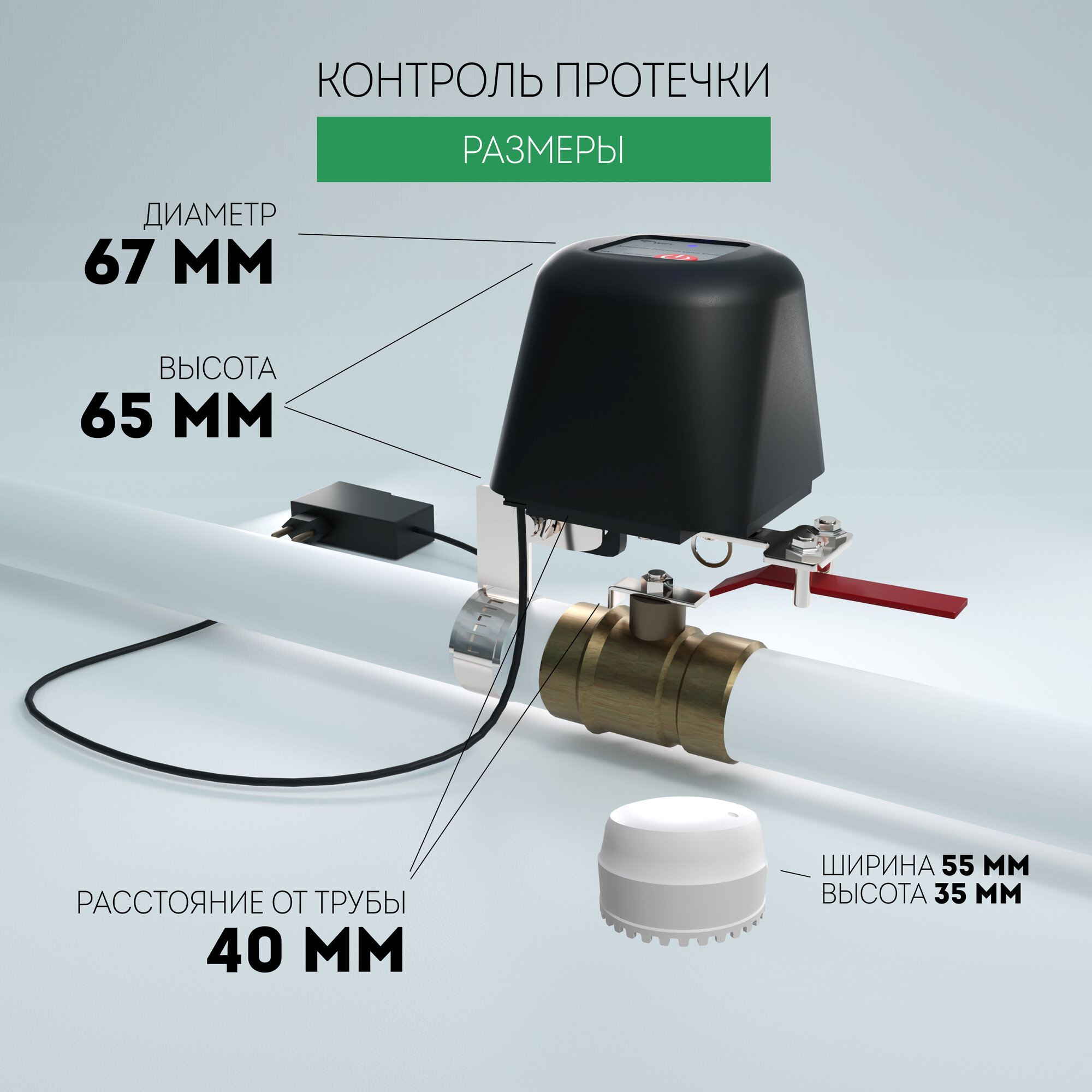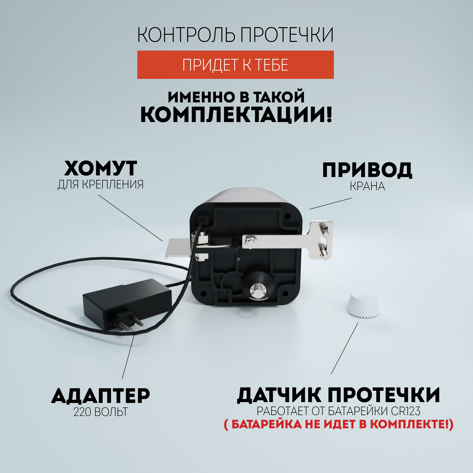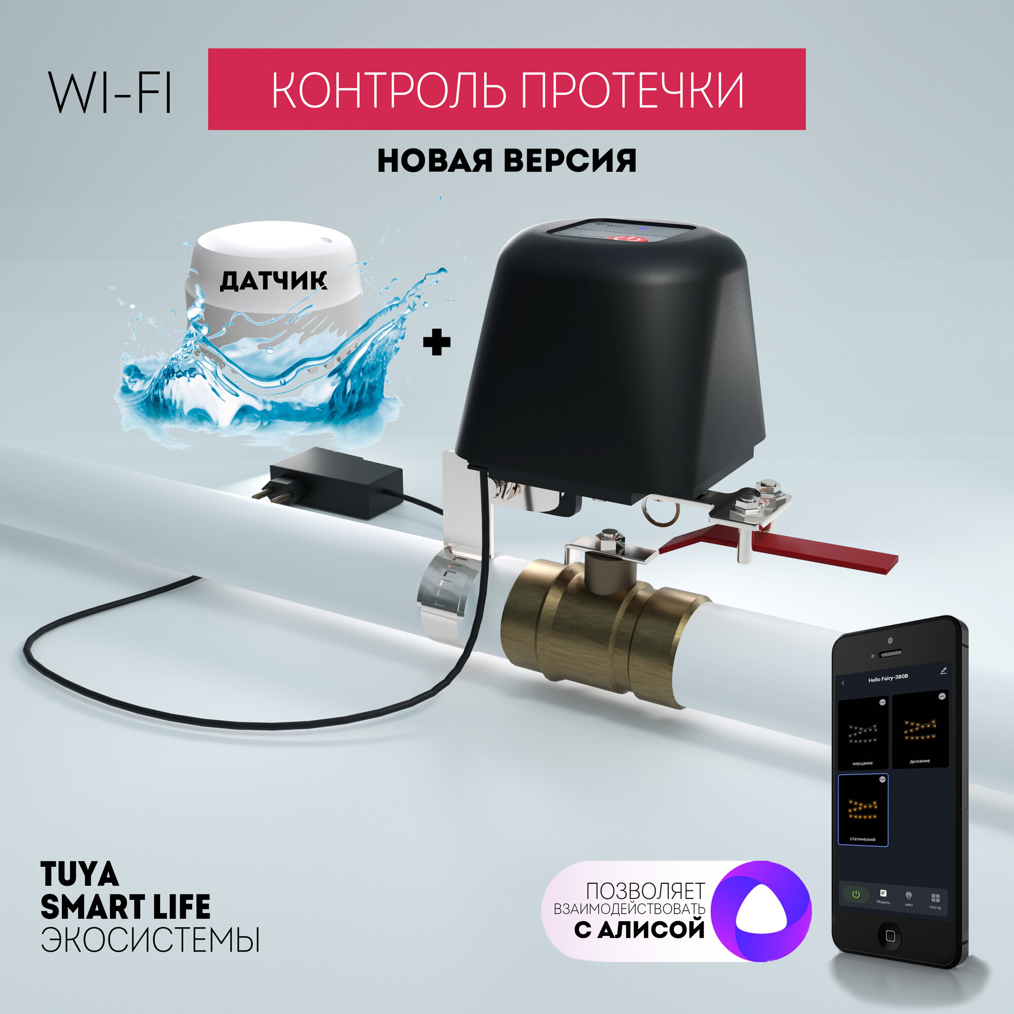 | Подробная комплектация | Устройство открытия/закрытия крана, комплект крепления к трубе, адаптер питания, беспроводной датчик протечки |