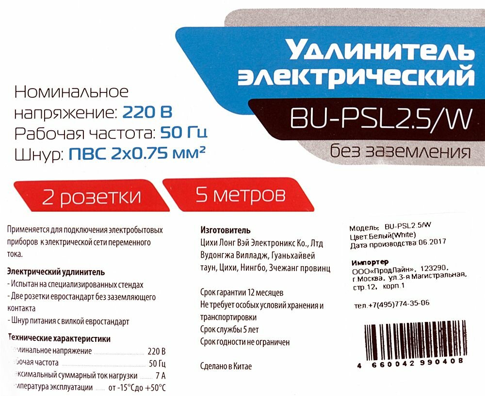 Купить Сетевой удлинитель Buro BU-PSL2.5/W 5м (2 розетки) белый (пакет ПЭ)